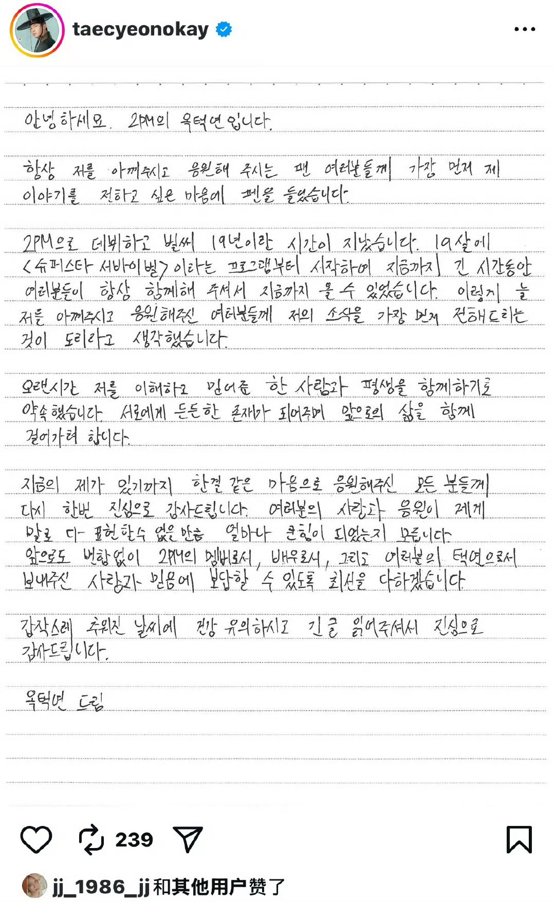玉泽演在ins发了手写信宣布结婚!!恭喜恭喜,女方是素人,要幸福啊