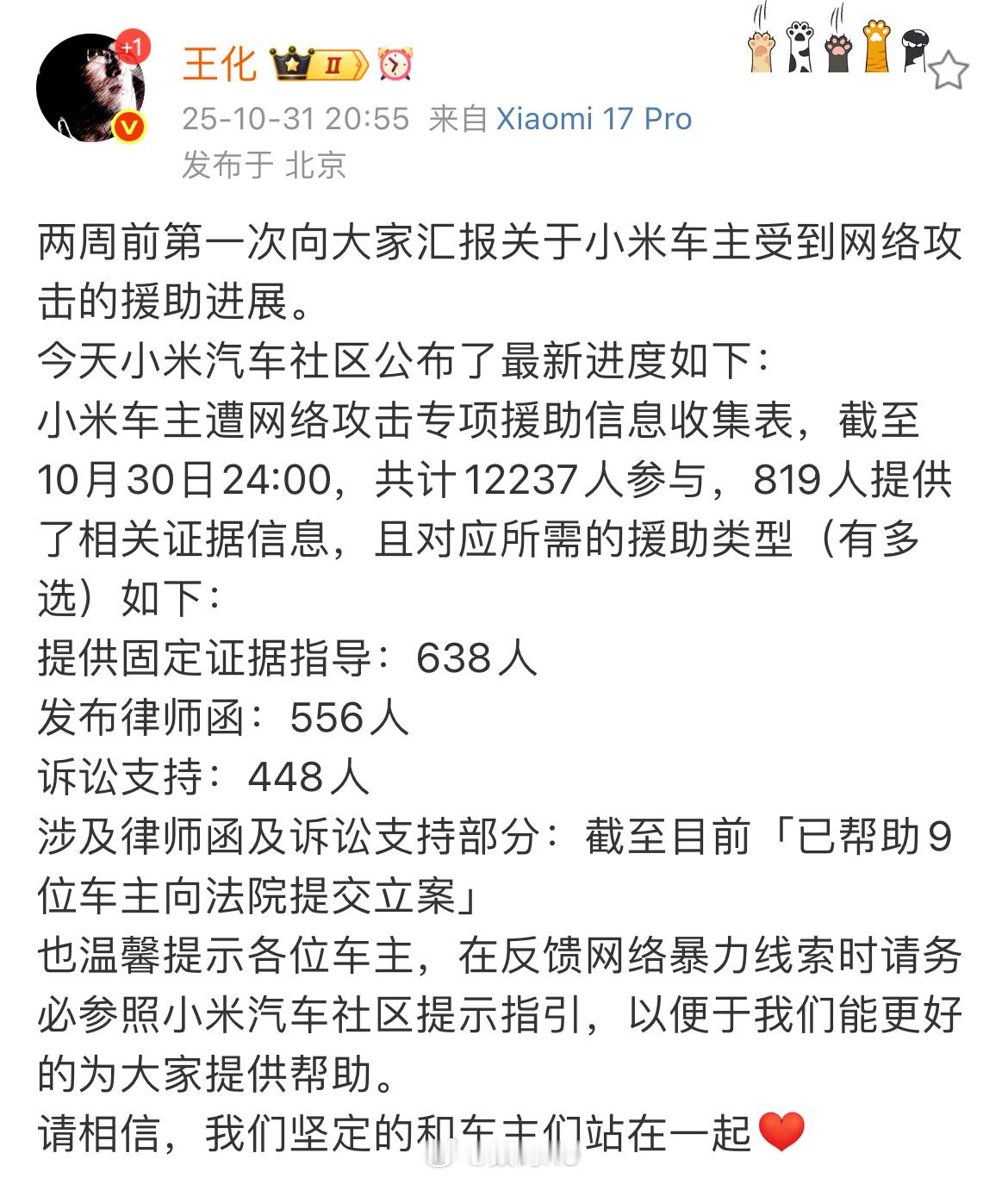 小米车主遭网络攻击专项援助情况,目前已经有九位已经提交立案了,等到时候出结果了,感觉会有点意思。