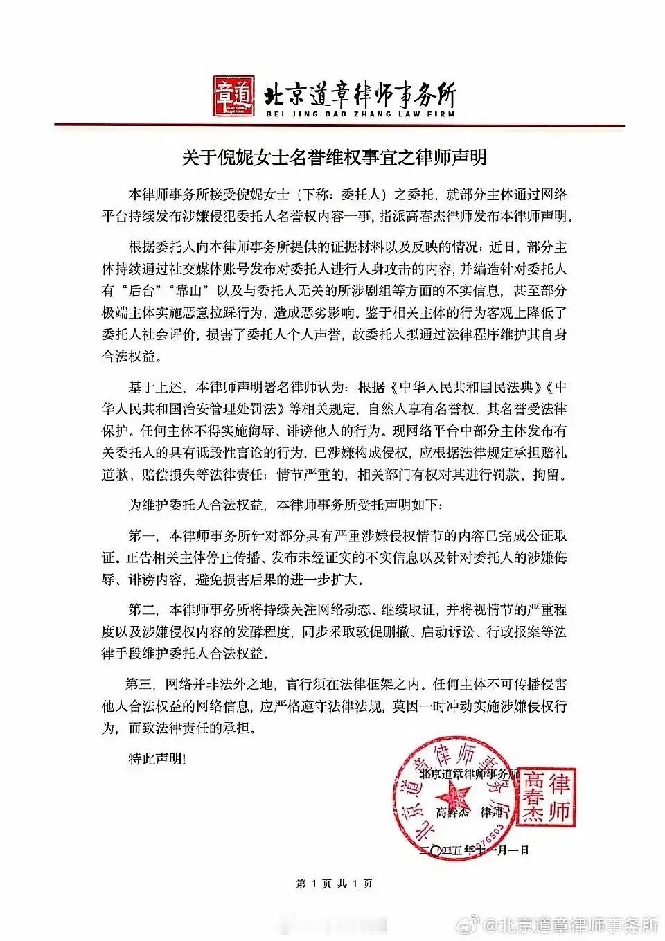 倪妮名誉维权声明