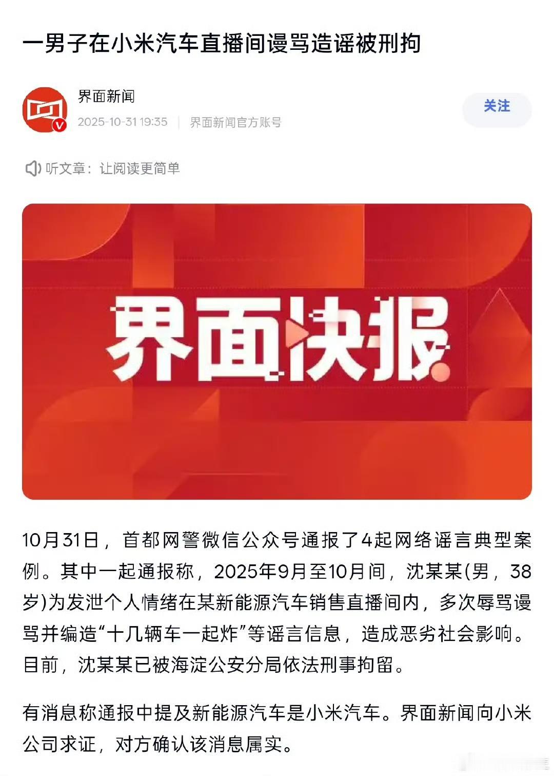 一男子为发泄个人情绪,在小米汽车直播间漫骂造谣被刑拘! 提醒大众网络不是法外之地,网络也是现实社会的延伸,说话还是要注意方式方法。 像这个男子的做法肯定是有问题的,大家可以理性表达的自己的观点,但是这样的做法很明显触犯了法律。 各位是怎么看的?欢迎评论区留言。