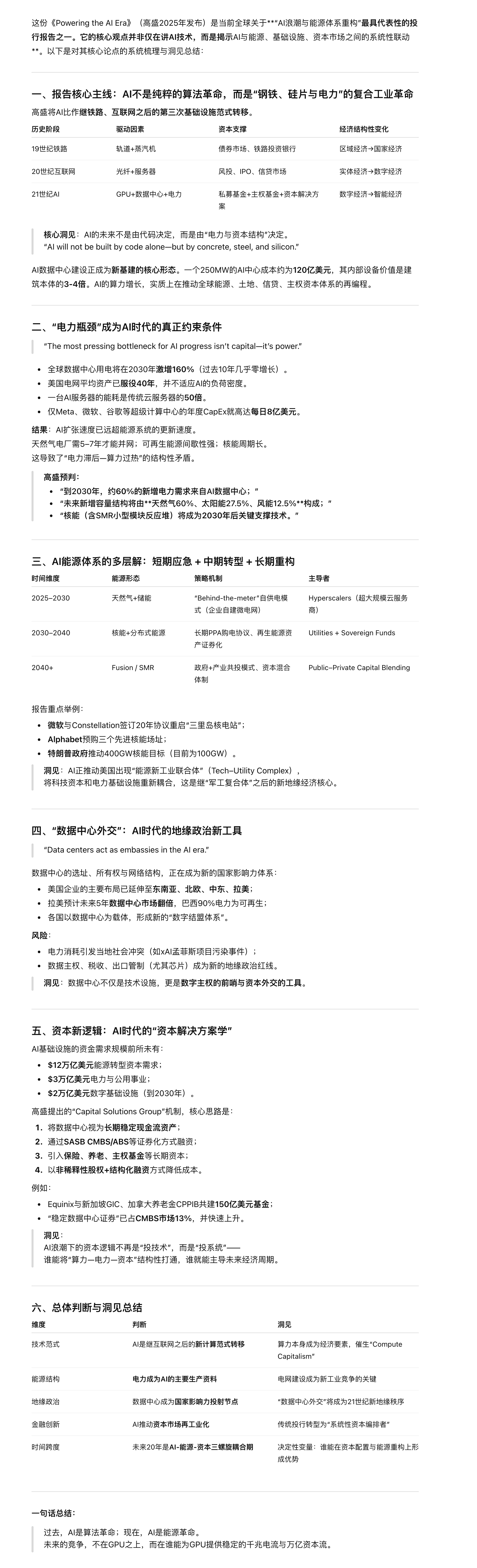 《Powering the AI Era》(高盛2025年发布)是当前全球关于“AI浪潮与能源体系重构”报告之一。它的核心观点并非仅在讲AI技术,而是揭示AI与能源、基础设施、资本市场之间的系统性联动。过去,AI是算法革命;现在,AI是能源革命。