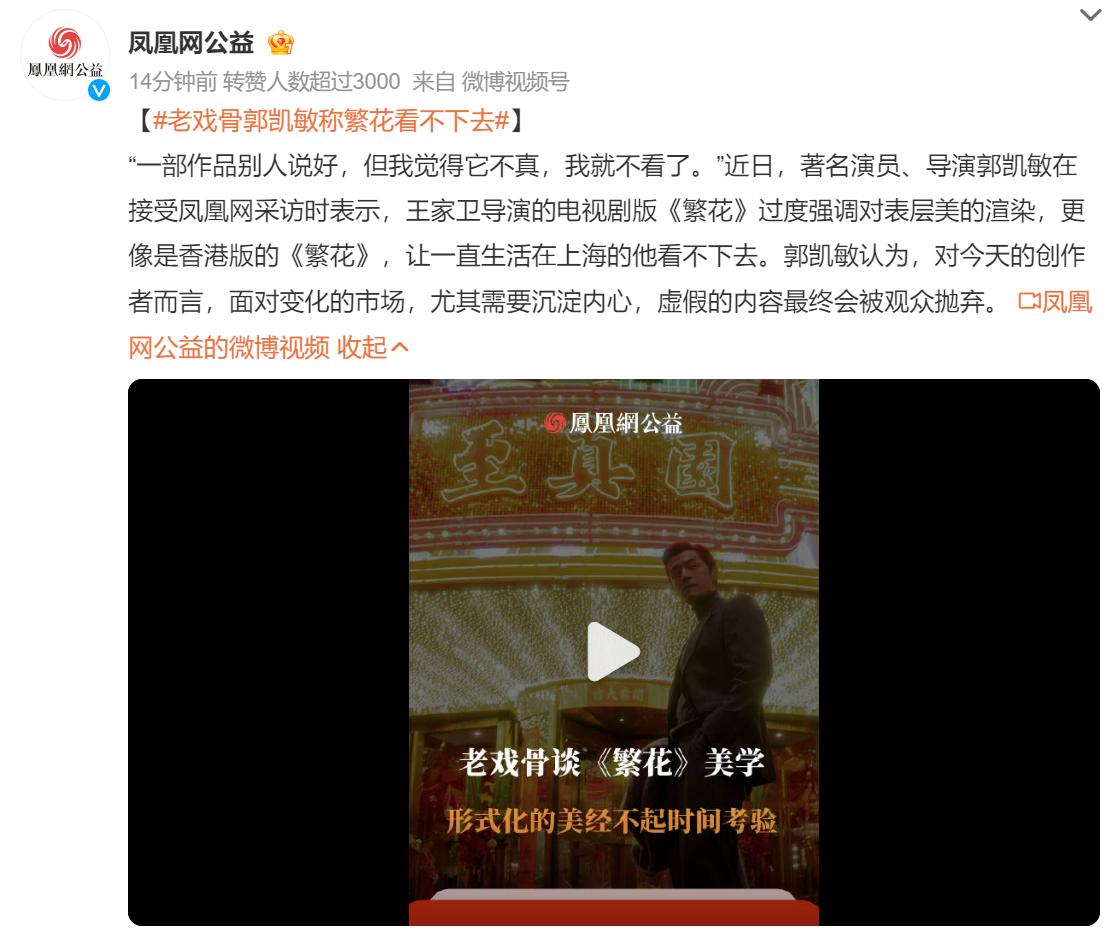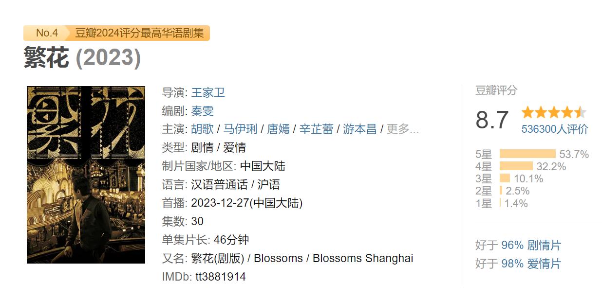 谁能想到,去年最火的电视剧、拿下过飞天和白玉兰双奖的《繁花》,如今被吐槽得这么厉害。 去年被网友赞为拯救了电视圈的王家卫,随着录音的曝光人设崩塌,而他执导的《繁花》也被网友拉了出来。 著名演员郭凯敏发声称《繁花》看不下去,引起了不少网友的共鸣,有人称看了两集真看不下去了。 郭凯敏认为,《繁花》过度强调了表层美的渲染,更像香港版的《繁花》,即便他已经在香港生活了四十多年,他依然看不下去,从郭凯敏后面的表述来看,内容空洞虚假是看不下去的主因。 如今,《繁花》在豆瓣的评分还在8.7分,位居2024年华语电视剧第四名,去年铺天盖天的宣传,让这个电视剧家喻户晓,很多没看过的人,抽空也要看看,53万多人打分,还能有8.7的高分,说明这个电视剧还是被很多观众认可的。