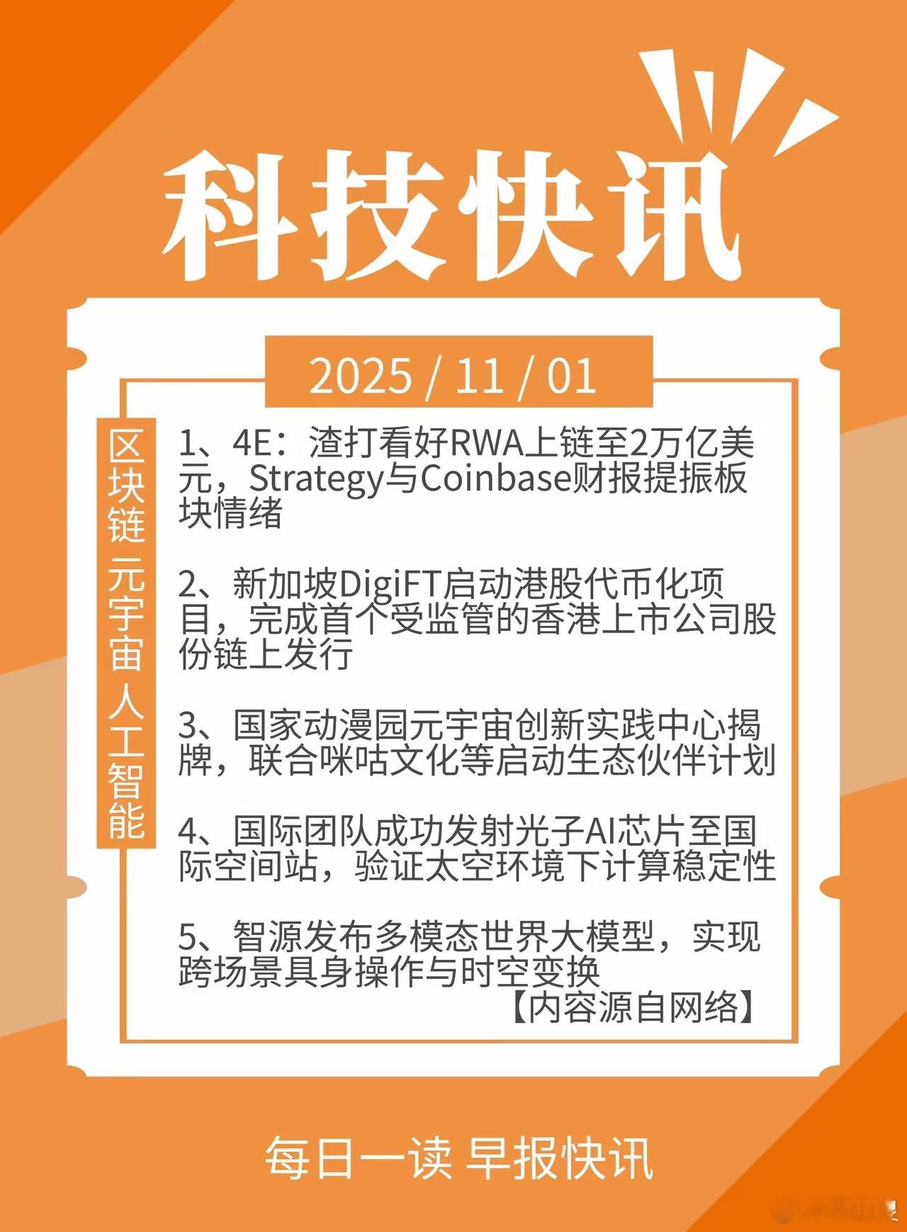 科技快讯|11月01日星期六1、4E:渣打看好RWA上链至2万亿美元,St