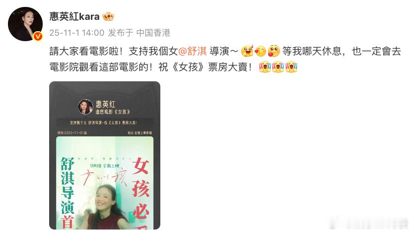 惠英红包场舒淇电影女孩惠英红为舒淇电影女孩包场:請大家看電影啦!支持我個女導演~ [哇][么么哒][爱你] 等我哪天休息,也一定會去電影院觀看這部電影的!祝《女孩》票房大賣![打call][打call][打call]