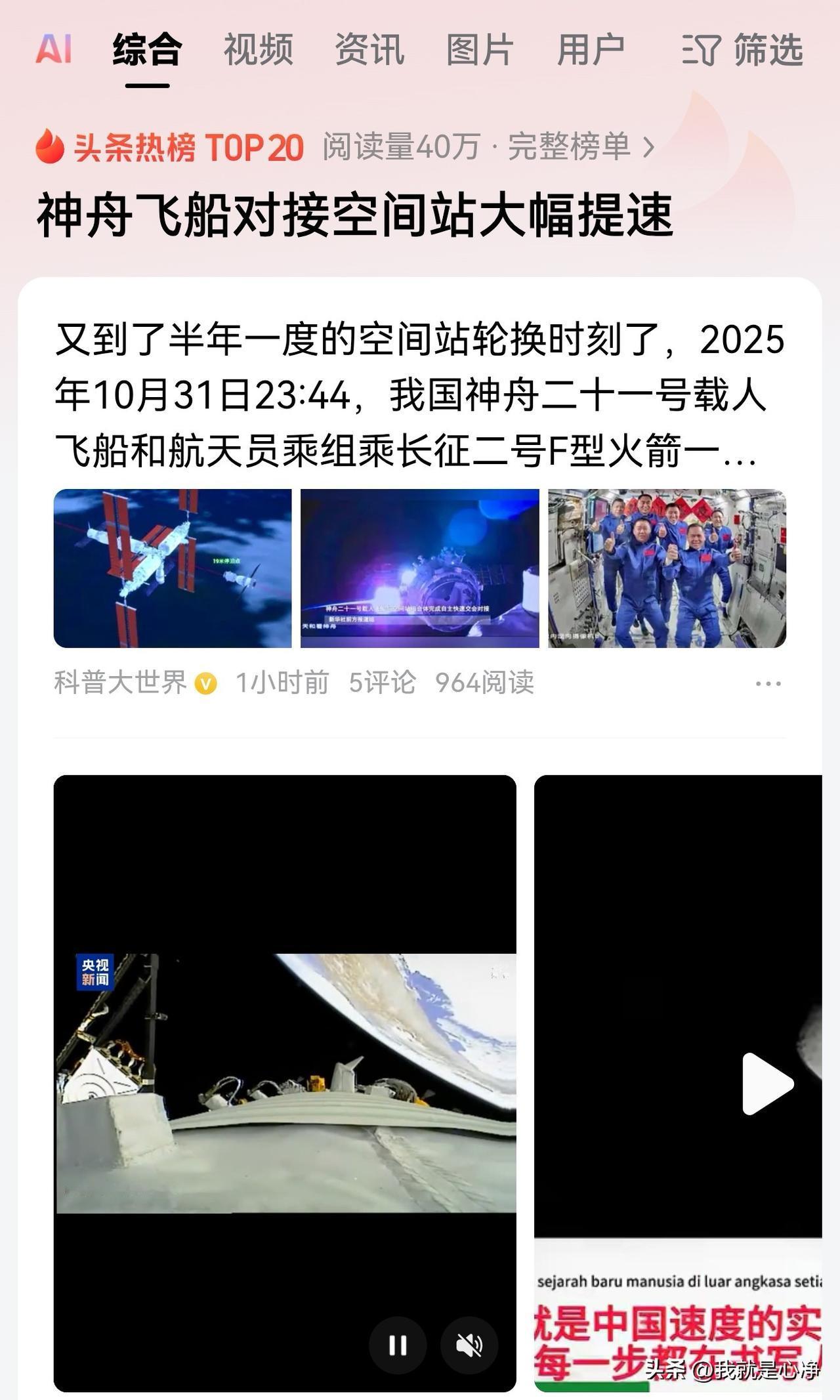 三个半小时啊,只有三个半小时。就相当于咱们坐高铁跨一个省的时间。 神舟飞船和天宫就对接完成了。 技术真的是越来越先进了。 最开始神舟8号和天宫对接的时候,需要不断的修正轨道,不断的调整。 用时43.5个小时才成功对接。 后来咱们不断的提高技术研究方案。 慢慢的就把对接的时间缩减到了6.5个小时。 就已经非常不容易了。 没想到这次咱们又创造了一个奇迹,三个半小时直接对接。 效率就是生命啊。 速度决定一切。 厉害了我的国! 技术越来越发达,未来咱们可能开发出更加适合普通民众的航天服。 包括飞船也会做一些舒适性的改进。 然后再一次的缩短时间。 总会有那么一天的,咱们可以让普通的老百姓不经过特殊的训练就可以乘坐飞船遨游太空。 我用发展的眼光看待问题。 相信一切皆有可能。