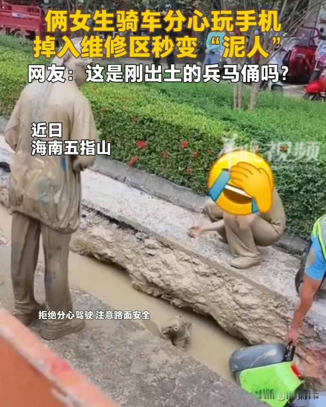 海南街头,2女生浑身裹满泥浆,像“刚出土的兵马俑”。路人瞅着新鲜,以为是接了泥塑工作,谁知,对方听后,“哇”地一声哭了。 10月26日,海南五指山街头,2女生骑着电动车,你一言我一语,笑声混着车轮碾过路面的轻响,格外热闹。 “你看这个视频!这只猴子居然会开椰子,比咱们刚才还熟练!” 穿外套的女生一只手紧紧攥着电动车车把,另一只手把手机举到穿短袖女生眼前,脑袋还往旁边凑了凑,眼睛盯着屏幕里的画面,嘴角都快翘到耳根。 穿短抽女生赶紧偏头去看,为了看清细节,还下意识松了松扶车把的手,只留指尖勾着:“我的天,也太聪明了吧!快转发我,回去给我妈看看。” 两人就这样一手控车,一手扒着手机,时不时低头戳两下屏幕,分享着视频里的笑点,偶尔抬眼扫一下前方路面,完全没留意到前方不远处,施工方早已立起了红色的围挡。 穿外套女生刚想开口说下一个视频的趣事,突然觉得车身猛地一撞,紧接着一股强烈的失重感裹住全身,她还没来得及喊出“小心”,就听见“扑通”一声闷响,冰凉又浑浊的泥水瞬间涌了上来,没过头颈。 穿短袖女生的反应也慢了半拍,只觉得眼前先闪过一片红色,紧接着就黑了下来,手机“啪嗒”掉进泥里,嘴里、鼻子里都呛进了泥水,又腥又涩。 等两人挣扎着从水坑里爬出来,才看见被撞歪的红色围挡歪在一旁,电动车压在围挡上,车轮还在空转,溅起更多泥浆。 再看看彼此,头发结成了泥团,衣服紧紧贴在身上,从头发丝到鞋尖都裹满了深褐色的泥浆,连眼睛周围都沾了不少,站在路边一动,还会往下掉泥渣,活脱脱两个“刚出土的兵马俑”。 路过的路人都停下了脚步,有人掏出手机偷偷拍照,还有人凑在一起小声嘀咕:“这俩姑娘是做泥塑的吧?怎么把自己裹得这么严实,也太拼了。” “说不定是艺术创作,故意弄成这样的,看着还挺像那么回事。” 这些话飘进穿外套女生耳朵里,她原本还懵着,脑子里满是刚才撞围挡、掉水坑的慌乱,这会儿听见路人的猜测,委屈突然就涌了上来。 她扯了扯满是泥浆的衣服,指尖碰到冰凉的布料,再看看朋友同样狼狈的模样,鼻子一酸,“哇”地一声就哭了出来,眼泪混着脸上的泥水往下淌,在下巴处汇成泥滴。 穿短袖女生本来还在强撑着,想先把电动车从围挡上挪下来,听见对方的哭声,自己的眼泪也忍不住了。 正在不远处施工的工人听见动静,赶紧拿着铁锹跑了过来,领头的大叔先看了看歪掉的围挡,心里忍不住嘀咕,“外围都拦上了,还能掉坑里也是厉害!” 可一转身,立刻语气关切地问道:“姑娘们没事吧?没摔着骨头吧?要不还是去旁边诊所看看?” 庆幸的是,两人虽然狼狈,但却没有受伤,附近店铺的一位店主还招呼她们进店冲洗,并提供了干净的衣服。 俩姑娘的“兵马俑”经历,说到底还是“一心不能二用”。骑车看手机,再显眼的围挡也成了摆设。好在有惊无险,也算吃一堑长一智,以后可得把安全放在心上。