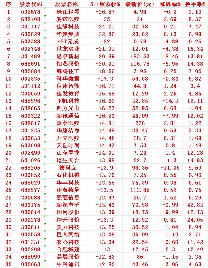 本周,整个市场“跌幅最多”的35名单 珠江钢琴:5日跌幅 -26.87%,换手率 2.13% 赛诺医疗:5日跌幅 -25.00%,换手率 8.37% 佳缘科技:5日跌幅 -24.21%,换手率 7.47% 华建集团:5日跌幅 -22.86%,换手率 6.99% *ST元成:5日跌幅 -22.00%,换手率 0.26% 世龙实业:5日跌幅 -21.91%,换手率 16.34% 思泉新材:5日跌幅 -20.89%,换手率 13.81% 灿芯股份:5日跌幅 -20.01%,换手率 14.38% 海鸥住工:5日跌幅 -18.56%,换手率 7.05% 科华数据:5日跌幅 -17.30%,换手率 6.82%