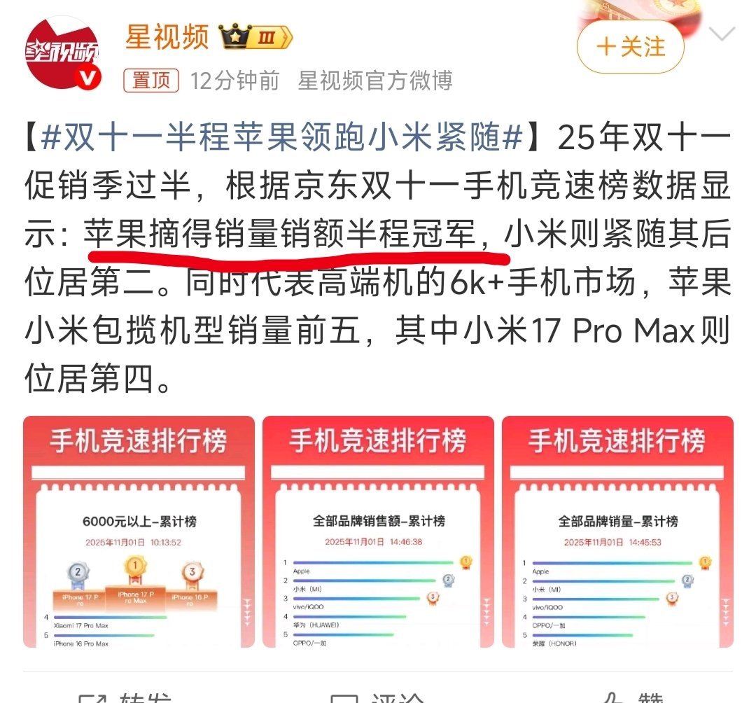 双十一半程苹果领跑小米紧随苹果手机的品牌价值还是太强悍了,顶着信号不好的debu