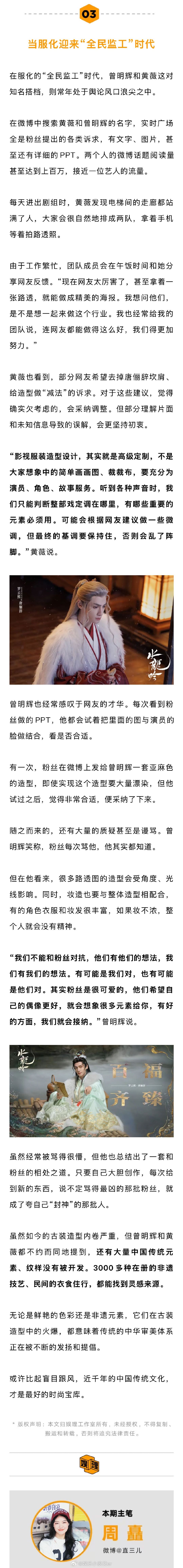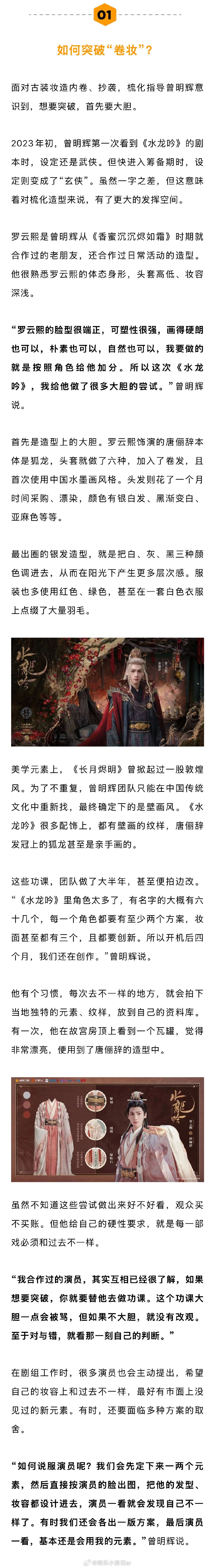 黄薇说罗云熙是天生拍古装的 黄薇曾明辉回应被网友监工 《水龙吟》梳化指导曾明辉在《香蜜沉沉烬如霜》时就和罗云熙合作过,他认为罗云熙的脸型很端正,可塑性很强。罗云熙饰演的唐俪辞本体是狐龙,头套就做了六种,加入了卷发,且首次使用中国水墨画风格。最出圈的银发造型是把白、灰、黑三种颜色调进去,从而在阳光下产生更多层次感…娱理独家↓