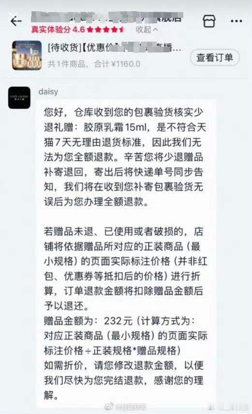 退货被指少退赠品遭扣232元好一个店大欺客,这要是发生在pdd,平台直接给商家禁言就给顾客退款了