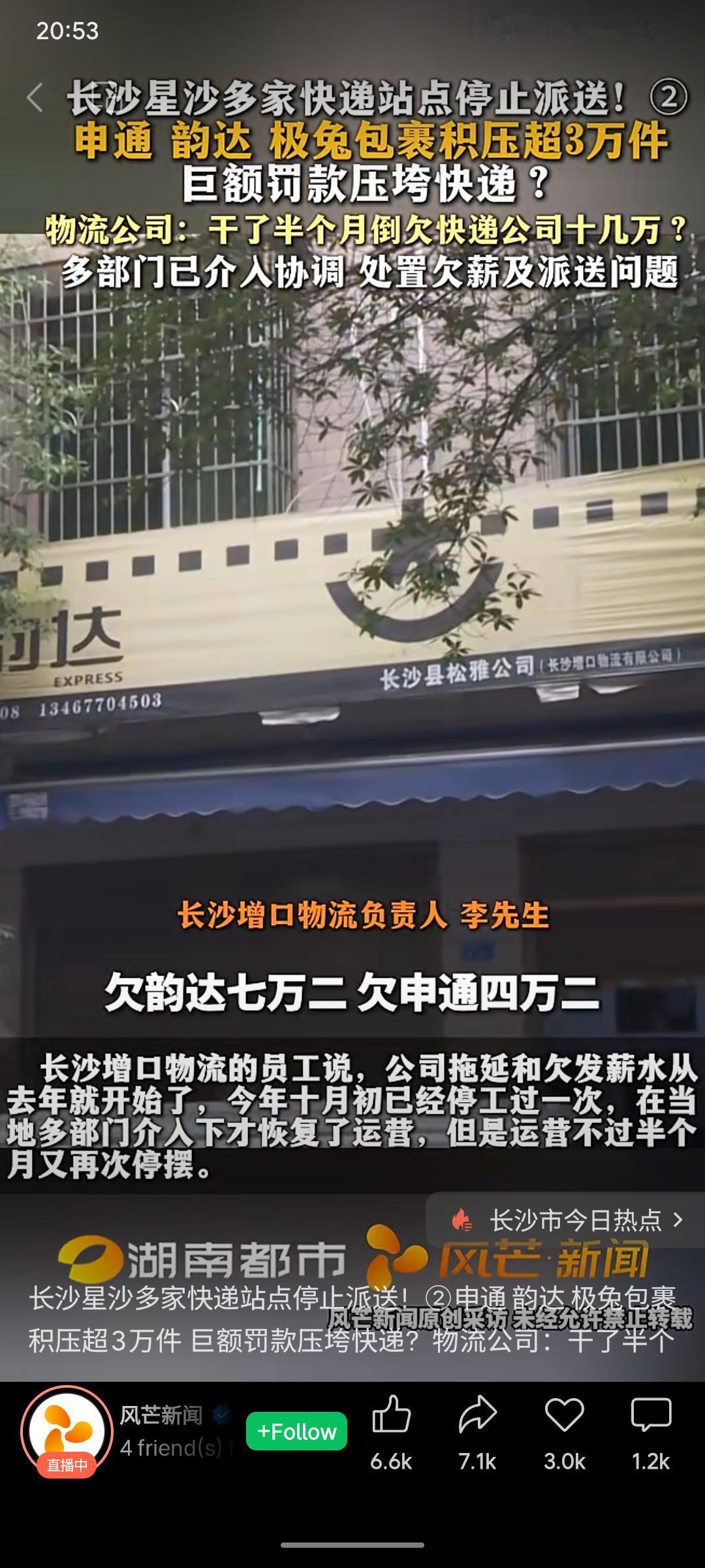近日,湖南长沙星沙片区申通、韵达、极兔多家快递站点因运营困难停止派送,积压包裹超
