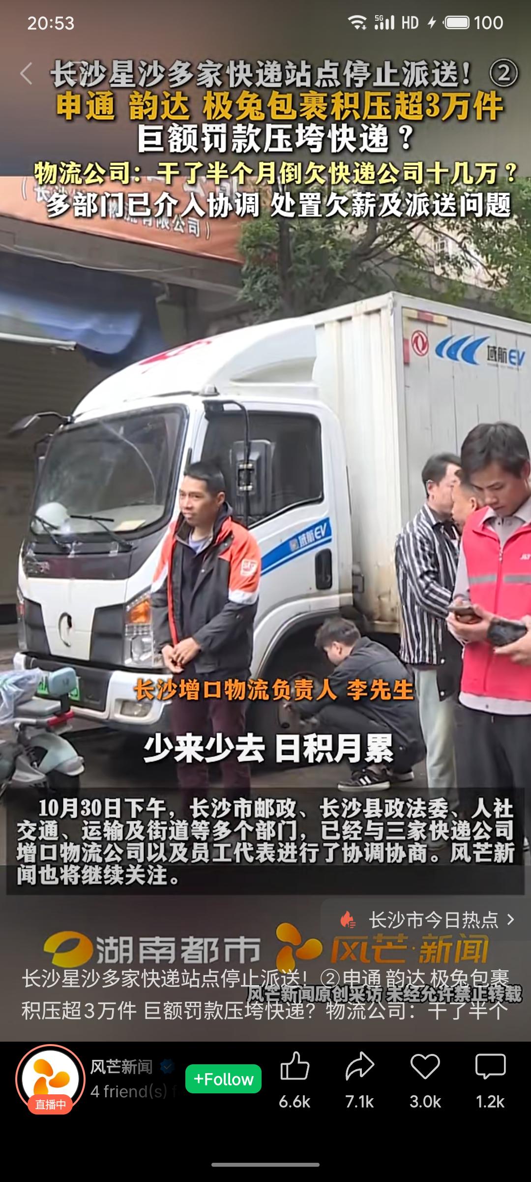 近日,湖南长沙星沙片区申通、韵达、极兔多家快递站点因运营困难停止派送,积压包裹超3万件。涉事物流公司负责人称,派费降低而罚款过重,导致经营难以为继,甚至出现“干了半月倒欠十余万”的情况,并存在欠薪问题。目前,邮政、人社等多部门已介入协调处置。