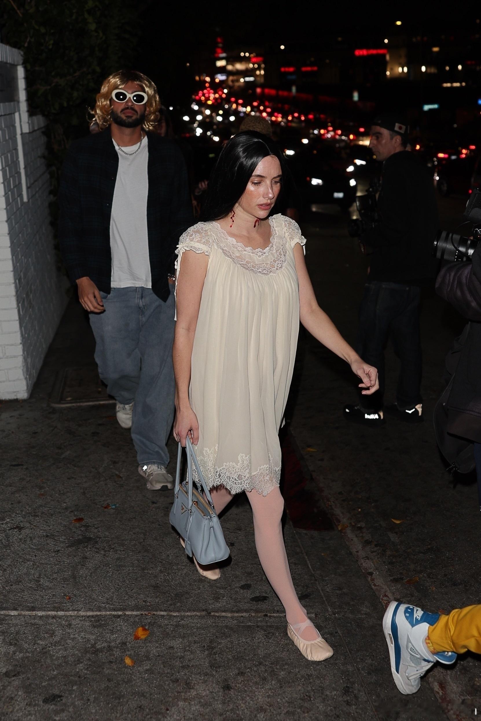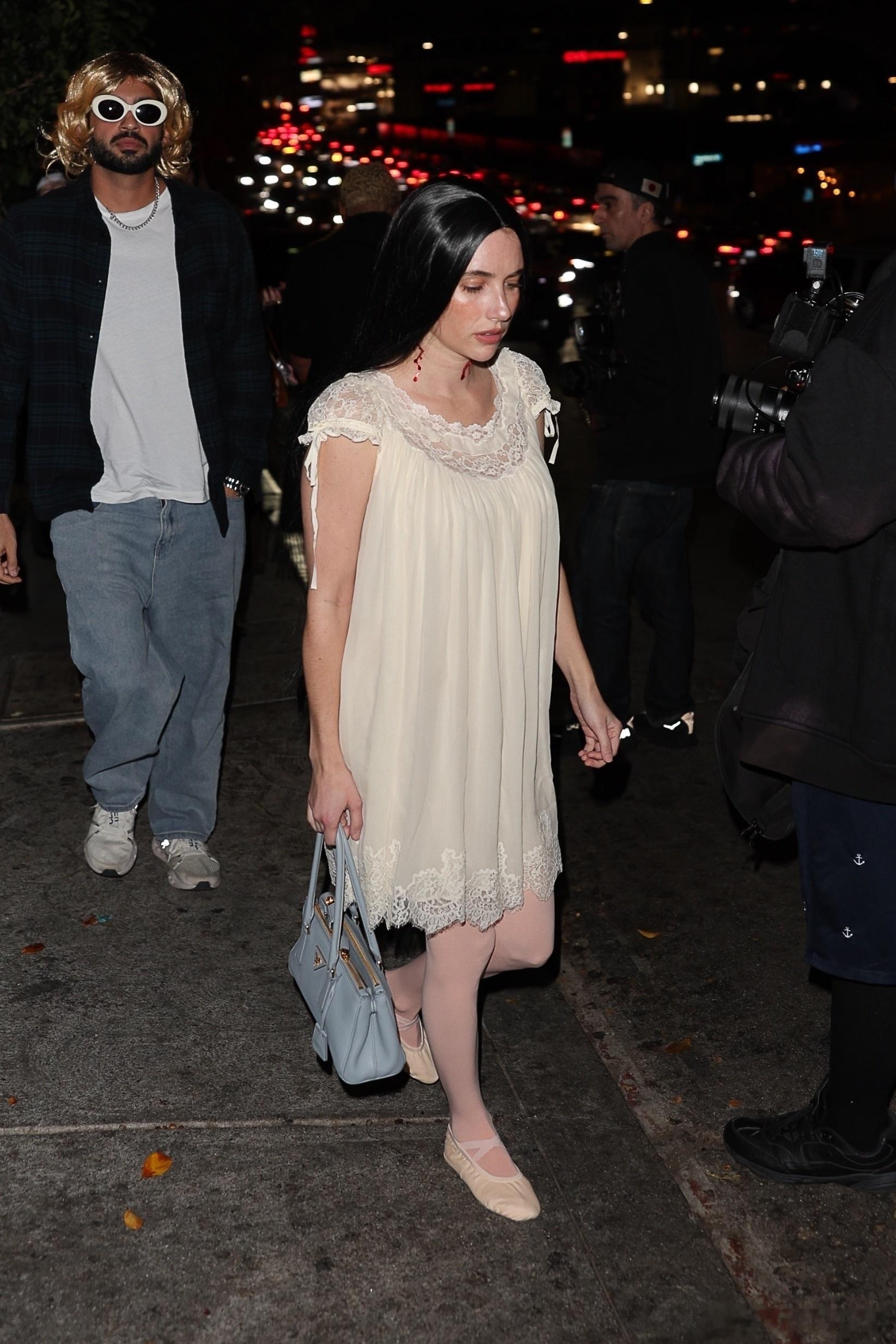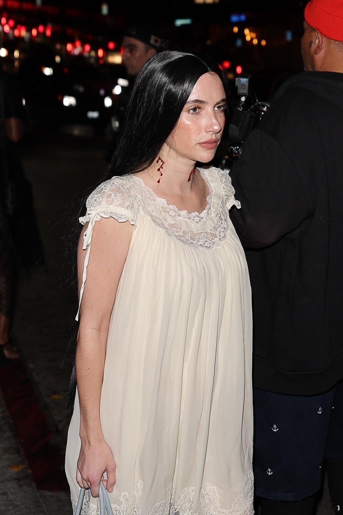 Emma Roberts艾玛罗伯茨在洛杉矶外出,前往Château Marmont参加Vas J Mrogan和Michael Braun举办的万圣节派对, 艾玛戴着黑色假发,穿着蕾丝睡衣裙搭配芭蕾舞鞋,脖子上挂着两道血痕