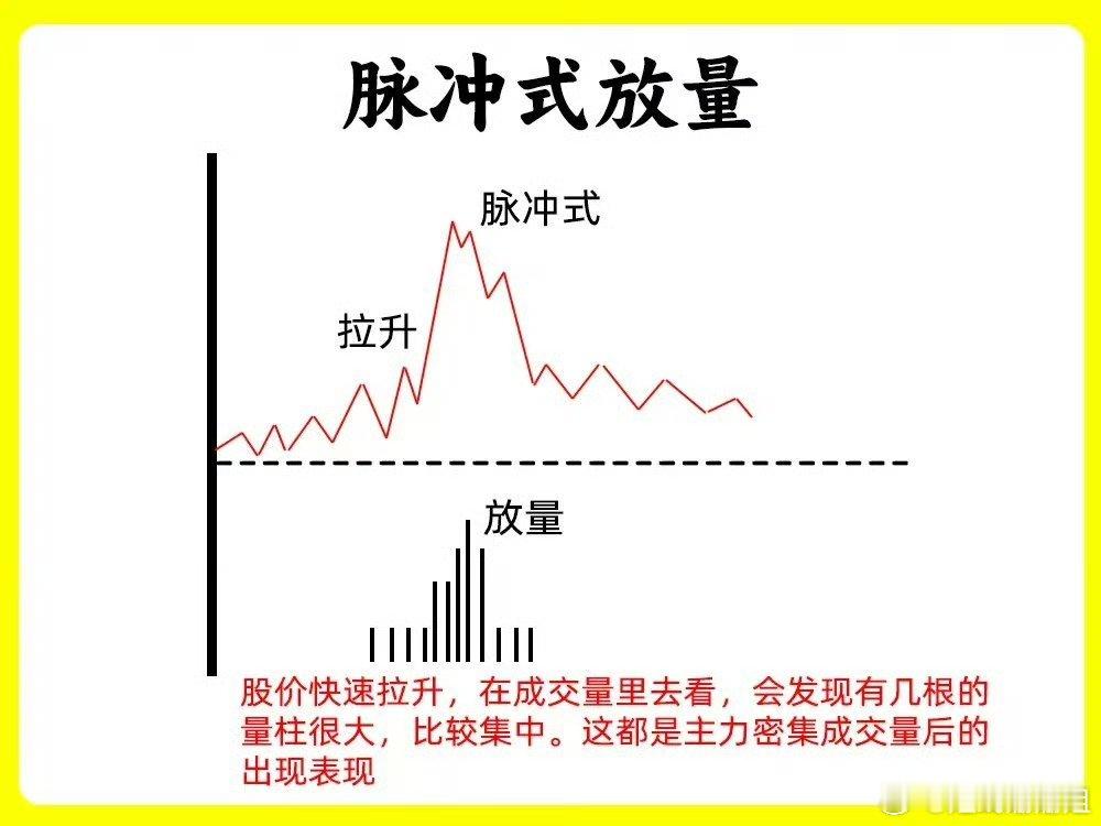 股价在低位,在分时图里,股价走势比较平稳,突然时不时出现放量冲击波,股价快速拉升,在成交量里去看,会发现有几根的量柱很大,比较集中。这都是主力密集成交量后的出现表现,所以往往主力在这种脉冲式上的时候,就会出现阶段性的放量