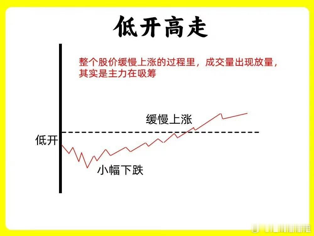 股价早盘低开往往是比较弱势的表现。在分时图里,股价出现早盘低开,随后继续小幅下跌,这种主力故意打压股价。随后股价开始缓慢上涨,突破开盘价,突破0轴,创出新高。整个股价缓慢上涨的过程里,成交量出现放量,其实是主力在吸筹