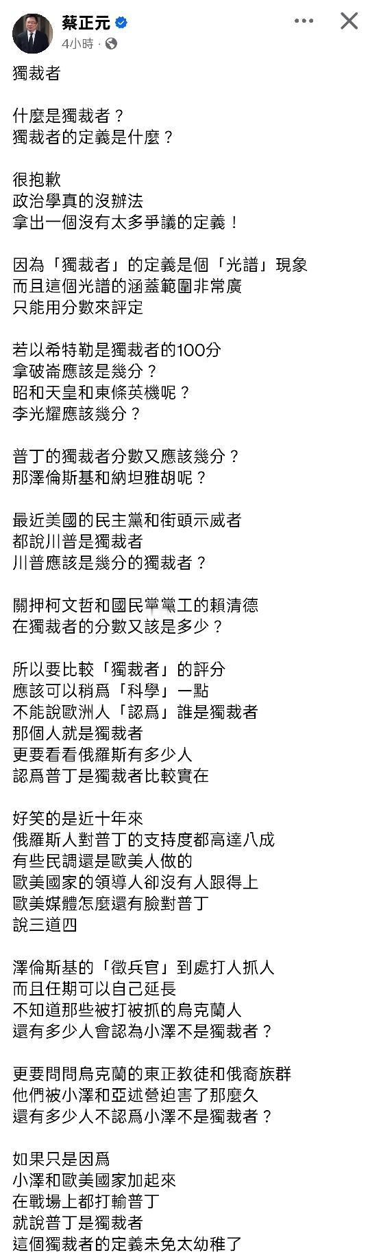 许多人因为蔡正元教授批评了郑丽文在接受德国之声的访问内容后,对蔡教授颇有微词。 有些网友倒有不同想法,毕竟啊,对于郑丽文这个老蓝男眼中的希望,若是像宝一样呵护着,能有啥好结果。 你看,蔡教授公开批评郑丽文回复不当后,又立刻发一篇不短的文章来给群众,用蔡教授自己的学知识,用他自己的眼光,来反馈给大家,何为独裁者? 何为独裁者? 独裁者如何鉴定? 如何为独裁者打分数? 是的,蔡教授用这篇文章狠狠打了德国之声这个媒体和这个采访记者的脸。 他用他的方式为样板做给郑丽文看 或许 这就是蔡教授提携后辈的另外一种方式 台湾省郑丽文