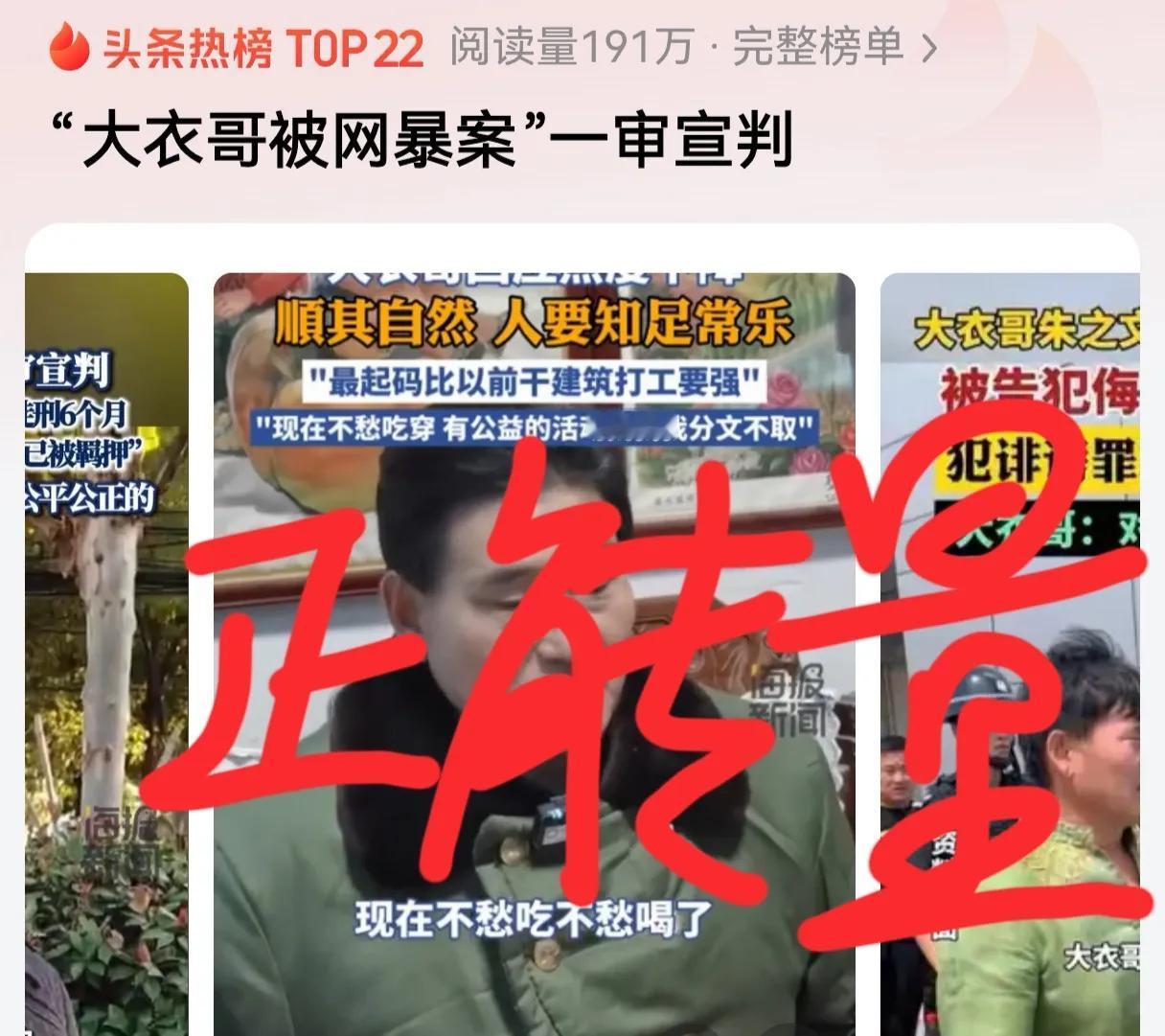 大快人心!网暴大衣哥的人被拘役了,活该!吃饱了没事撑的,人家大衣哥不偷不抢,靠自己的本事吃饭,碍你什么事了!判太轻了! 大衣哥依法纳税比太多人强了,有多少人因为这事栽了,大衣哥还热身公益,热心捐助,正能量农民兄弟!