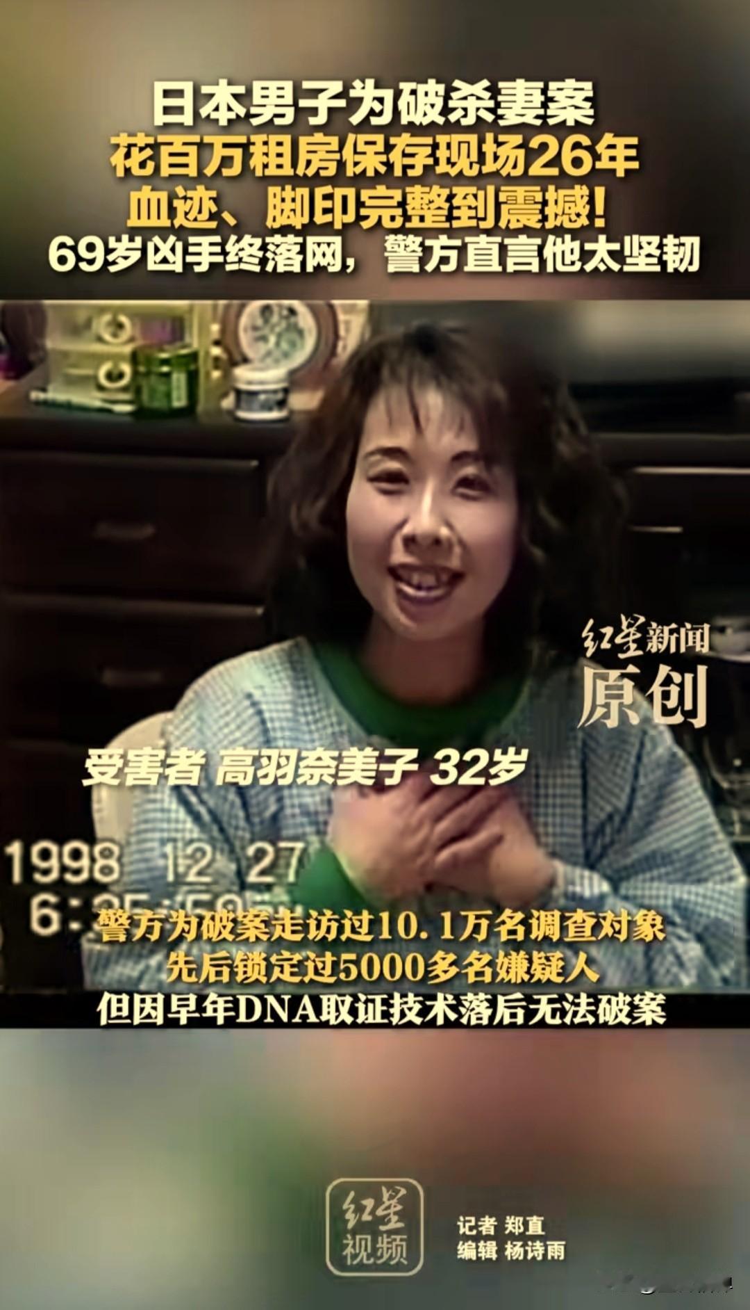 日本男子为破杀妻案,为保留现场证据,坚持租房26年,累计房租支出2200万元日元(约合百万人民币),终于等到凶手落网,水落石出的时候。 案发时间1999年11月13日,名古屋32岁的高羽奈美子在租住的公寓被刺身亡,2岁的儿子航平在场目睹但幸免于难。 警方为破案走访超10.1万名调查对象,先后锁定过5000多名嫌疑人,但因早年DNA取证技术落后无法破案,此案一度陷入僵局。 为了不破坏现场,丈夫高羽悟在妻子遇害后继续租下公寓保存现场26年之久,甚至连玄关处的血迹都保持原状,花费2200万日元,只为尽可能保留证据,等待真相大白的一天。 案件的转折点发生在2025年10月31日,时年69岁的安福久美子主动到警局自首,经过检测,案发现场的血迹DNA和她的DNA样本完全一致。 令高羽悟意外和震惊的是,这名罪犯安福久美子竟然是他的高中同学,两人还曾同属软式网球队,案发前一年在同学会上他们还有过交谈。 此案的告破也给其他悬案家属带来希望,只要不放弃,悬案也有昭雪的一天,高羽悟还积极参与受害者家属组织,为推动日本在2010年废除杀人罪公诉时效做出了努力。 警方在破案后特别指出,正因为高羽悟先生长期完整的保存了现场,才使得确认许多关键信息和推进调查成为可能。 来源:红星新闻