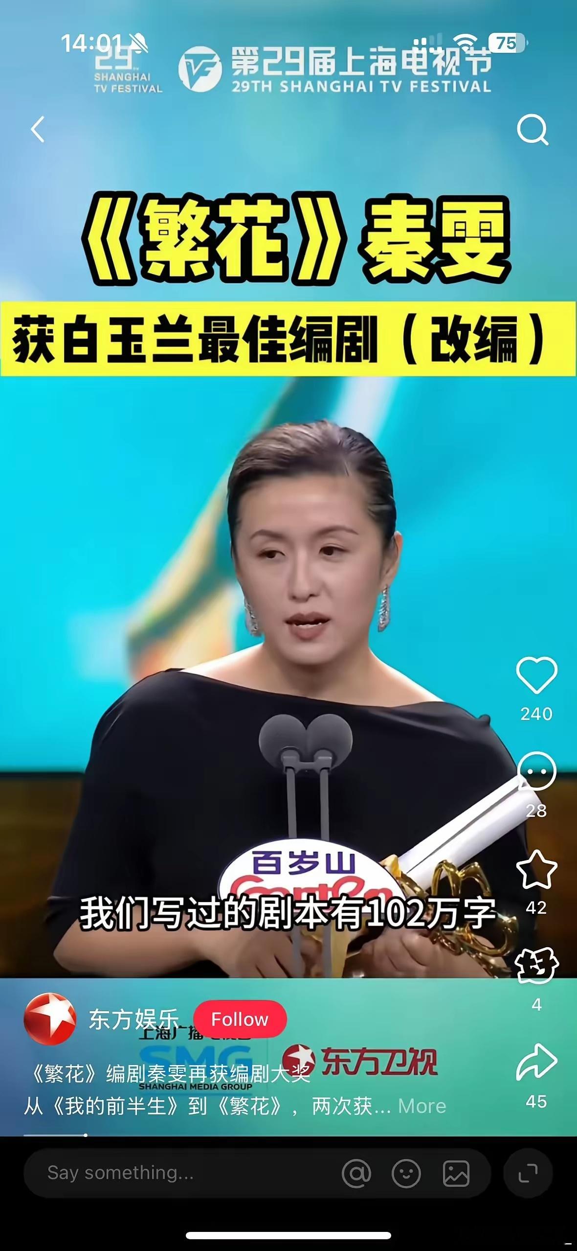 ​秦雯也算是才貌双全了,82年出生,才43岁就已经拿下了两个白玉兰最佳编剧奖,除了《繁花》,马伊琍主演的《我的前半生》也是她作改编的,获得当年最佳编剧,实至名归。