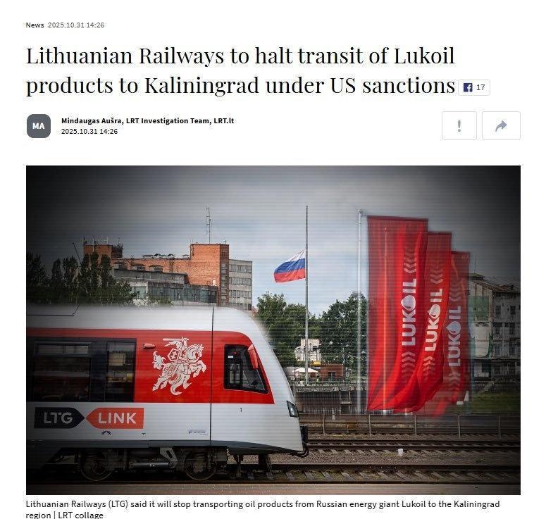 從 11 月 21 日起,立陶宛將停止透過立陶宛鐵路向加里寧格勒運輸俄羅斯石油產品,以遵守美國和英國的製裁。
