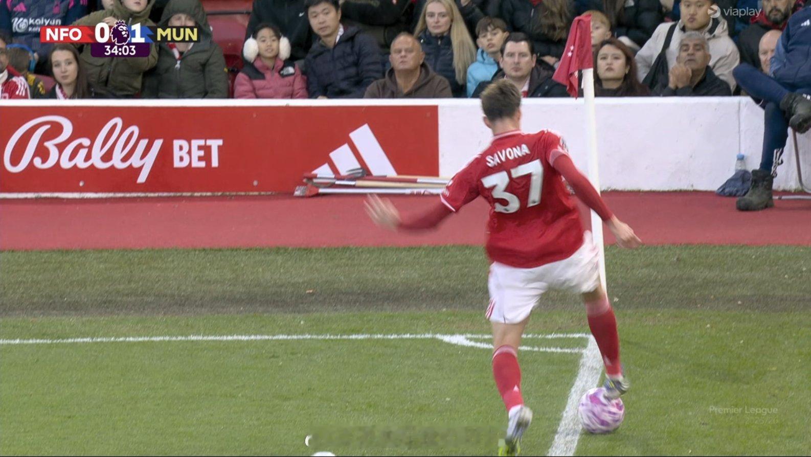 【英超争议判罚:球是否出界?】诺丁汉森林vs曼联,卡塞米罗为曼联首开记录的进球,源自于角球,而角球本身存在争议,皮球是否整体出底线,森林主帅和球员都在投诉这个事情,主裁坚持判出角球。