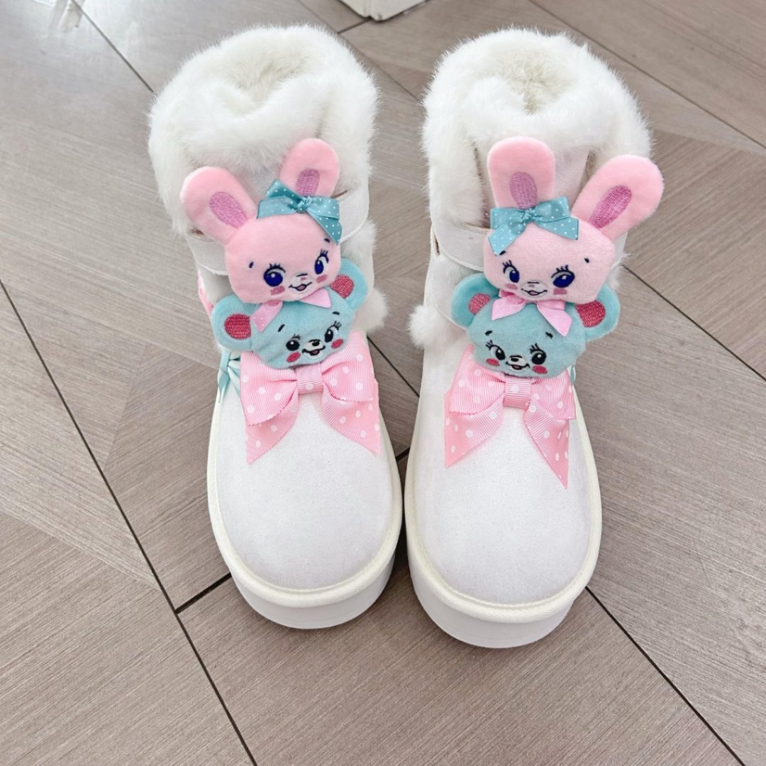 粉色款是甜度超标软萌代表,麂皮质感细腻温柔,鞋口一圈毛绒像裹了团云朵,后跟的粉色猫耳直接戳中少女心。白色款则是元气担当,毛绒鞋口暖呼呼,鞋身的粉兔蓝熊公仔搭配波点蝴蝶结,把可爱玩出了层次感。更绝的是它还能“变色”,换上粉色鞋身配件,又能解锁全新甜系造型。