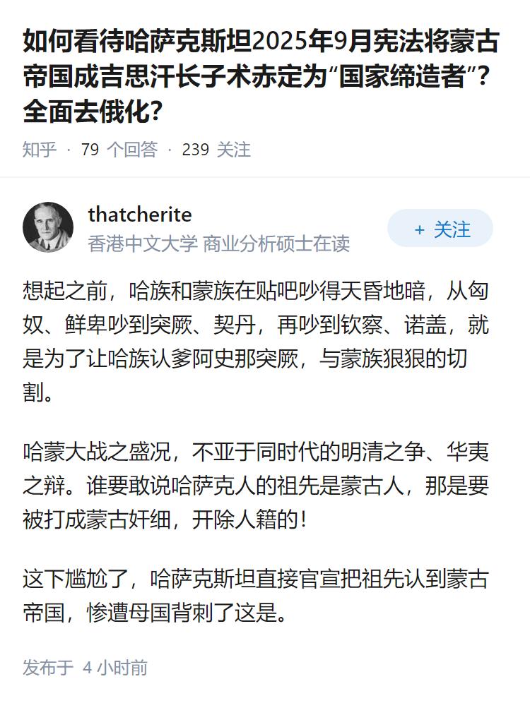 如何看待哈萨克斯坦2025年9月宪法将蒙古帝国成吉思汗长子术赤定为“国家缔造者”?全面去俄化?