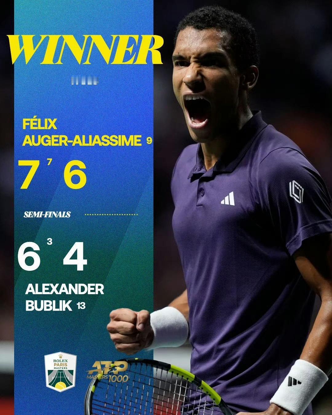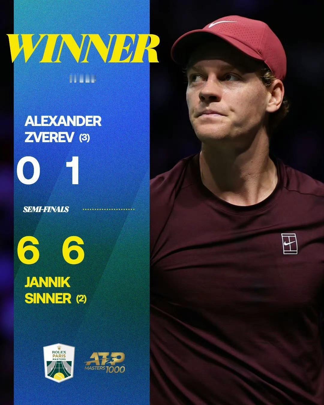 药加辛啊,知道你会赢,但没想到赢得这么残忍!小心调查……冠军又是他的,能战胜他的只有抽筋了…… 仅耗时62分钟,辛纳6-0/6-1横扫世界第三兹维列夫晋级巴黎大师赛决赛,室内硬地25连胜。即便阿卡来了,也得输,只是少输两局而已。 另外一场半决赛,阿利亚西姆次盘1-4连赢5局,以7-6/6-4力克布勃利克,跻身巴黎大师赛决赛。冠军积分即时反超穆塞蒂,总决赛稳了。