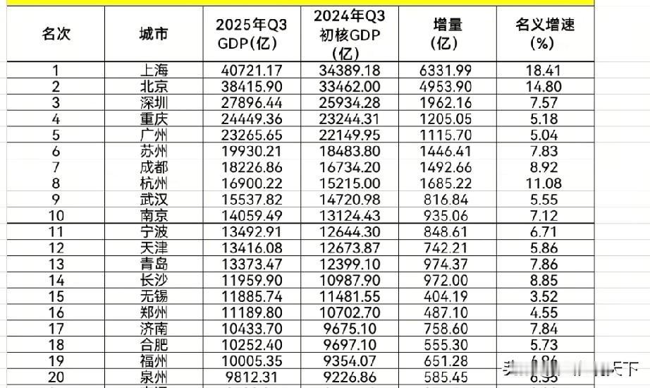 中国前20强城市的南北分布,南方15个,北方5个 2025年前三季度,中国各地的
