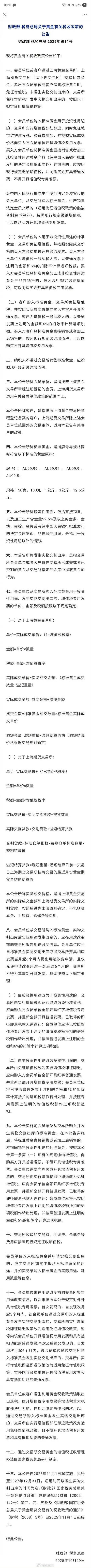 【琅河财经】财政部的最新通知,如果倒查的话,小中型黄金经营机构基本全部破产。相当于给水贝这样的集散市场上了个枷锁,以后除非销售交易所的标准金条,否则都要加上13%增值税。 非标准金条的黄金制品还有额外5%消费税。 而且法律里早就是这样规定的,实操中比较混乱,像大多行业一样,过去法律严苛但执法不严,如果倒查的话,小中型黄金经营机构基本全部破产。