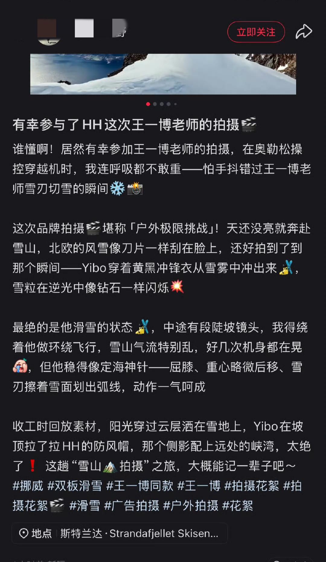 “最绝的是他滑雪的状态🎿,中途有段陡坡镜头,我得绕着他做环绕飞行,雪山气流特别乱,好几次机身都在晃,但他稳得像定海神针——屈膝、重心略微后移、雪刃擦着雪面划出弧线,动作一气呵成。 ” 这是又一位参与海丽汉森雪山大片的工作人员讲述的拍摄花絮,他说“我连呼吸都不敢重——怕手抖错过王一博老师雪刃切雪的瞬间”。 谁懂啊,王一博的广告就是如此真实和酷炫的大片质感,那些一万次的棚拍摆拍绿幕“替身”营造出来的氛围和镜头,都不如王一博在冰天雪地白雪覆盖的雪峰之上来一次真正的“户外极限挑战”来的震撼。 这样的王一博,哪个品牌能不爱?