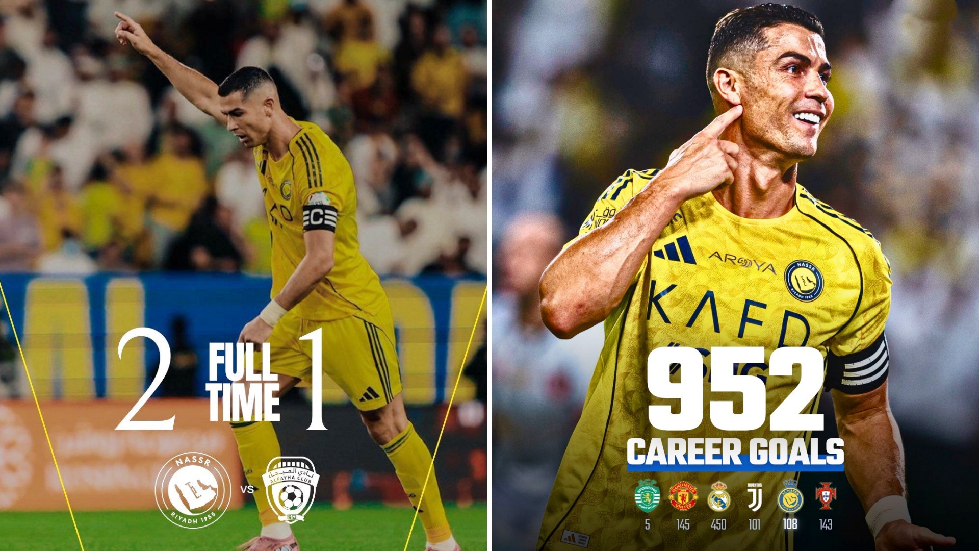 沙特联:利雅得胜利主场2-1逆转费哈,开局豪取7连胜。 雷梅塞罗率先进球,C罗扳平比分,104分钟读秒点射绝杀+生涯第952球。