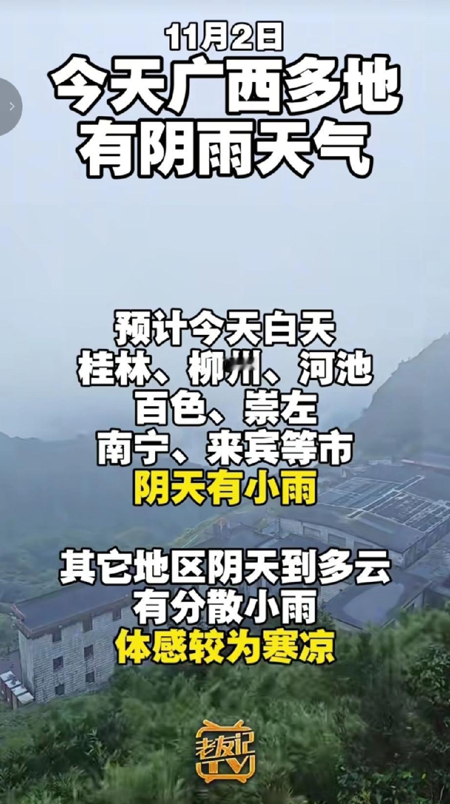 据广西气象部门预测11月2日广西多地有阴雨天气。今天8时全区大部地区气温在20℃以下。预计当天白天,桂林、柳州、河池、百色、崇左、南宁、来宾等市阴天有小雨,其他地区阴天到多云有分散小雨,体感较为寒凉。