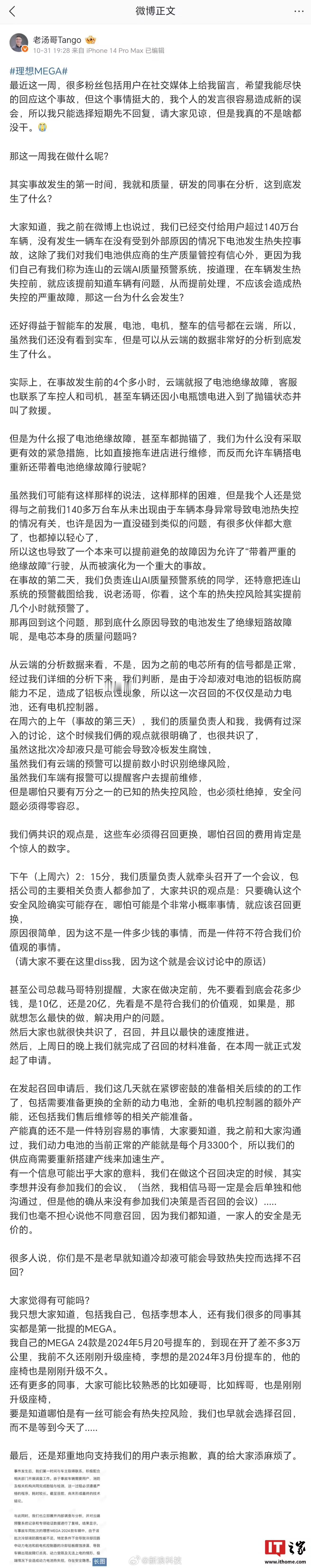 【理想高管回应MEGA起火事件:事故发生前 4 个多小时,云端就报了电池绝缘故障并联系司机】理想汽车产品线负责人汤靖 10 月 31 日在微博详细说明了“MEGA 2024 款起火事件”,并透露事故发生的第一时间,自己就和质量,研发的同事在分析。他表示,事故发生前的 4 个多小时云端就报了电池绝缘故障,客服也联系了车控人和司机,甚至车辆还因小电瓶馈电进入到了抛锚状态并叫了救援。