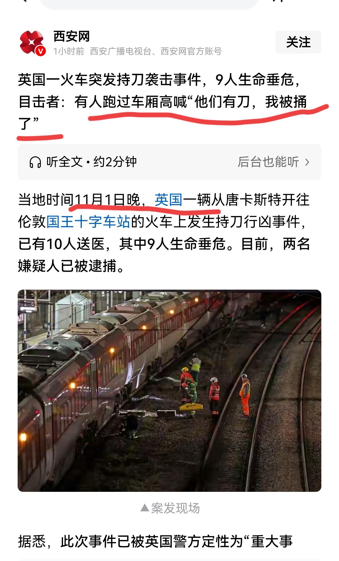 昨天夜里大英火车上爆发惨案, 有人带刀上火车造成9人生命垂危。 大英子警方定性为“重大事件”,暂时已经抓获两名犯罪嫌疑人。 看到外国的惨案,突然想到有段时间,网络上被人带起一股攻击火车地铁安检的节凑。 现在回想起来,真是背后一阵冷汗。