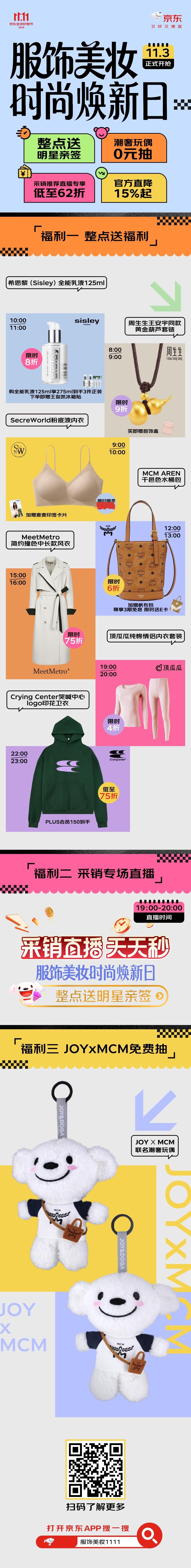 京东你果然没让我失望,这优惠力度是真大啊!这么多超级福利你是说送就送!过冬的秋衣裤还不到百元!在服饰美妆直播间跟着京东采销买买买,各种服饰美妆都能便宜入手,低至62折!11.3还有整点送明星亲签和MCM联名JOY玩偶0元抽!实在是太心动啦!!11.3 来京东搜索“服饰美妆1111” ,8-23点,每个整点都送福利,连送16小时!一到整点就整活 还等什么,锁定11.3京东时尚焕新日 更多福利戳戳 京东11.11 又好又便宜 买服装上京东