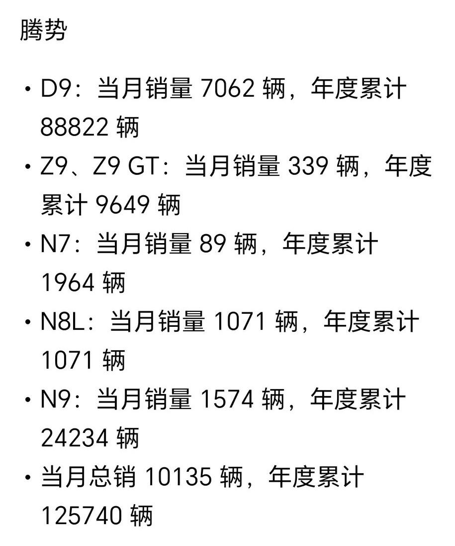 不管你信不信,这就是赤裸裸的事实! 10月,售价33.49万起的腾势Z9 腾势Z9GT全球销量329辆 10月,售价23.98万起的腾势N7全球销量89辆 10月,售价38.98万起腾势N9全球销量1574辆 10月 ,售价30.98万起的腾势D9全球销量7062辆 而10月底刚上市的腾势N8L销量1071辆。 腾势品牌是比亚迪旗下的高端豪华品牌,比亚迪一些高端技术都用在这个品牌上,但是销量一直不温不火,前两年靠腾势D9一辆车月销量就能破万,但是10月份整体销量也仅1万出头。 10月28号上市的腾势N8L让人眼前一亮,月销量有1071辆,据了解目前订单量已经超过2万辆。 腾势N8L是一款大六座SUV,起售价仅需29.98万起,比腾势N9便宜9万,这款车全系标配易三方技术,配备2.0T三电机插混系统,纯电续航230公里,综合续航超过1300公里,此外还标配云辇-A、后轮转向、天神之眼-B等配置。 大家腾势N8L会成为腾势品牌打造的第二个爆款吗?