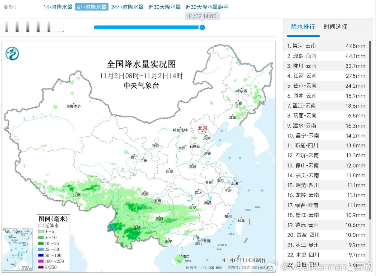 今天08-14时降水主要在西南和华南。云南以及海南站点包揽6小时降水榜前十。今天下午到明天中午,云南多地、四川南部、贵州东部、海南岛东部还有大雨-暴雨。
