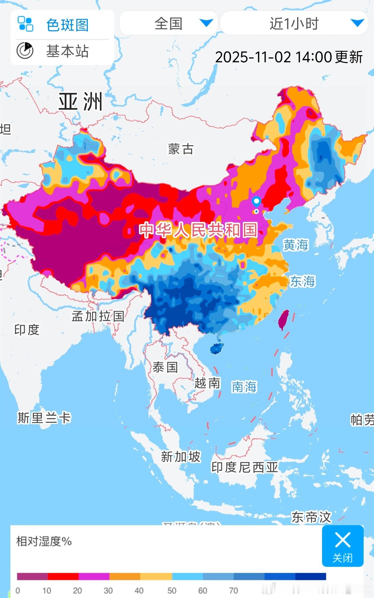 【降水和干燥】今天白天北方多地晴朗干燥。下午有大片区域的相对湿度不足30%,部分站点低于20%,比如内蒙古赤峰、辽宁朝阳、河北唐山、山东泰安、甘肃酒泉。