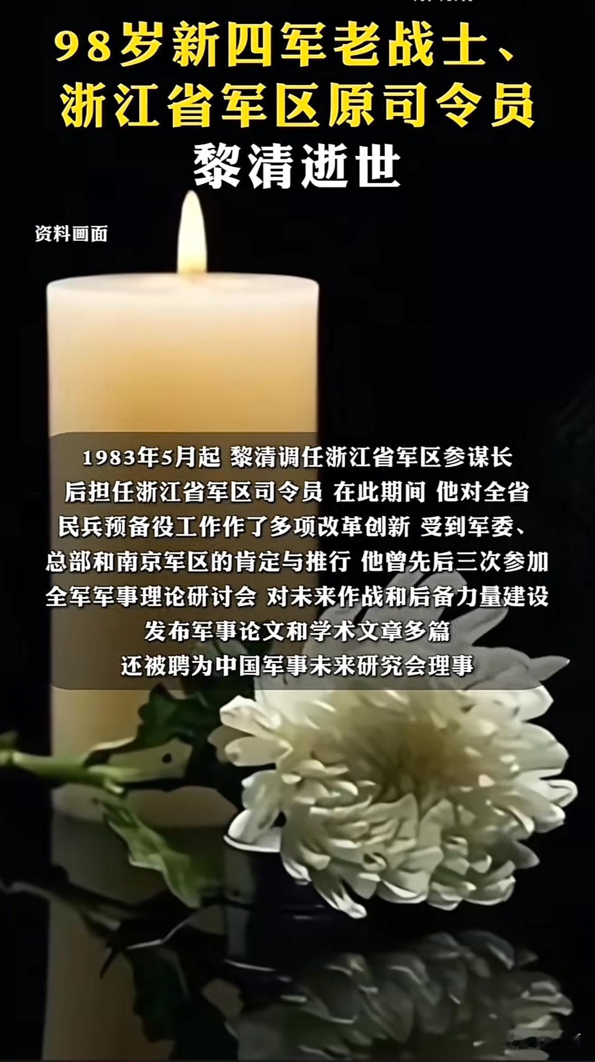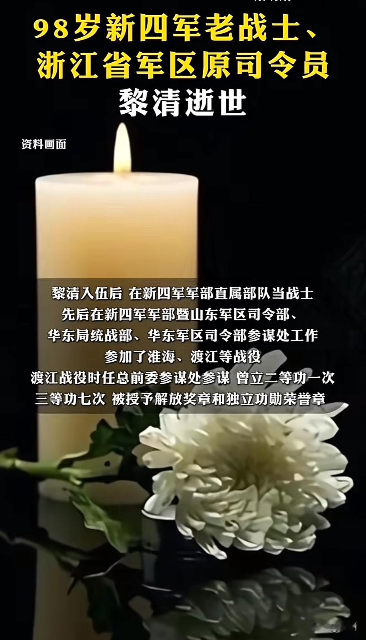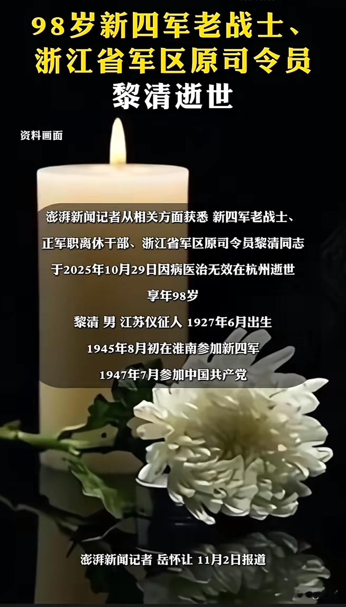2025年10月29日,98岁新四军老战士黎清在杭州病逝。他1945年参加新四军,打过淮海、渡江战役,立过二等功1次、三等功7次,后来担任浙江省军区司令员,革新民兵预备役工作,还推动浙江普法和军事法规建设。 老一辈用鲜血和一生护家国,每枚勋章都是实打实的奉献。现在的安稳日子,全靠他们当年拼命打拼。我们不能忘了这些英雄,要记住他们的事迹,传承这份爱国担当。向老战士致敬,他们的精神永远值得我们学习。