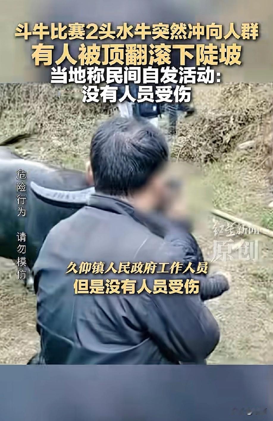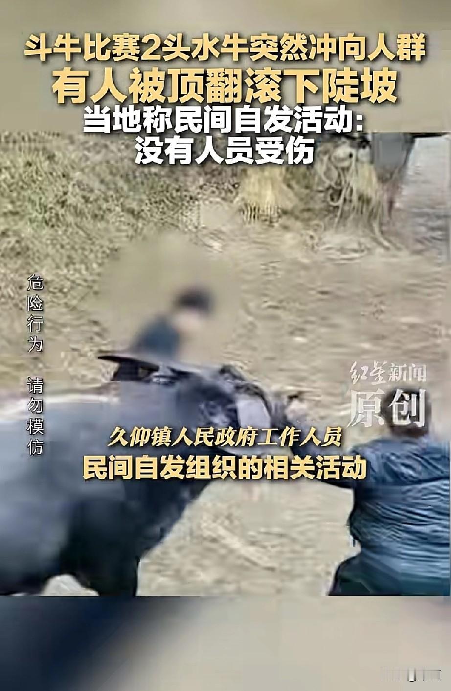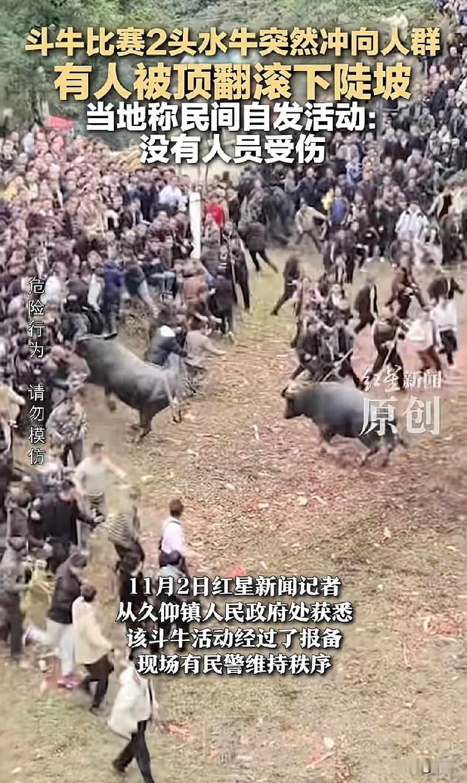 2025年11月1日,贵州剑河县久仰镇斗牛场,两头水牛追逐时突然冲向人群,有人被顶翻滚下坡坎。镇政府回应活动已报备,两名民警现场维持秩序,牛只牵拉时曾脱手,好在没人受伤。 斗牛是西南少数民族传统民俗,热闹归热闹,安全隐患真不小。就算报备了,现场防护也得做足。不能光靠民警维持,围栏加固、应急措施都得到位。 民俗要传承,但不能拿安全当赌注。相关部门该多把关,规范场地设施和管理流程。观众也得自觉守规矩,别近距离围观。这样才能既留住民俗特色,又保障大家安全。