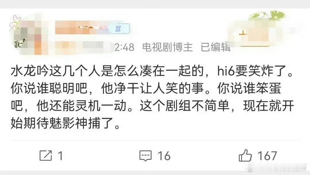 水龙吟剧组集体确诊抽象型人格你好星期六敖子逸[超话]本来看剧被剧情吸引,看了综艺彻底爱上剧组!全员喜剧人属性拉满,抽象中透着可爱。