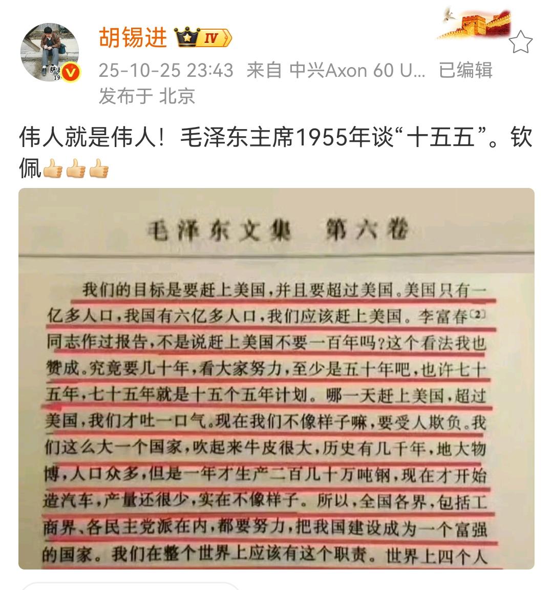 胡锡进:伟人就是伟人!毛泽东主席1955年谈“十五五”。钦佩[赞][赞][赞] 毛主席伟大的远见,真的是要实现了!75年的时间努力的结果,现在慢慢是在变成现实。 各行各业能有现在取得的成绩,都是靠一代又一代人接力而创造的结果。 各位是怎么看的?欢迎评论区留言。