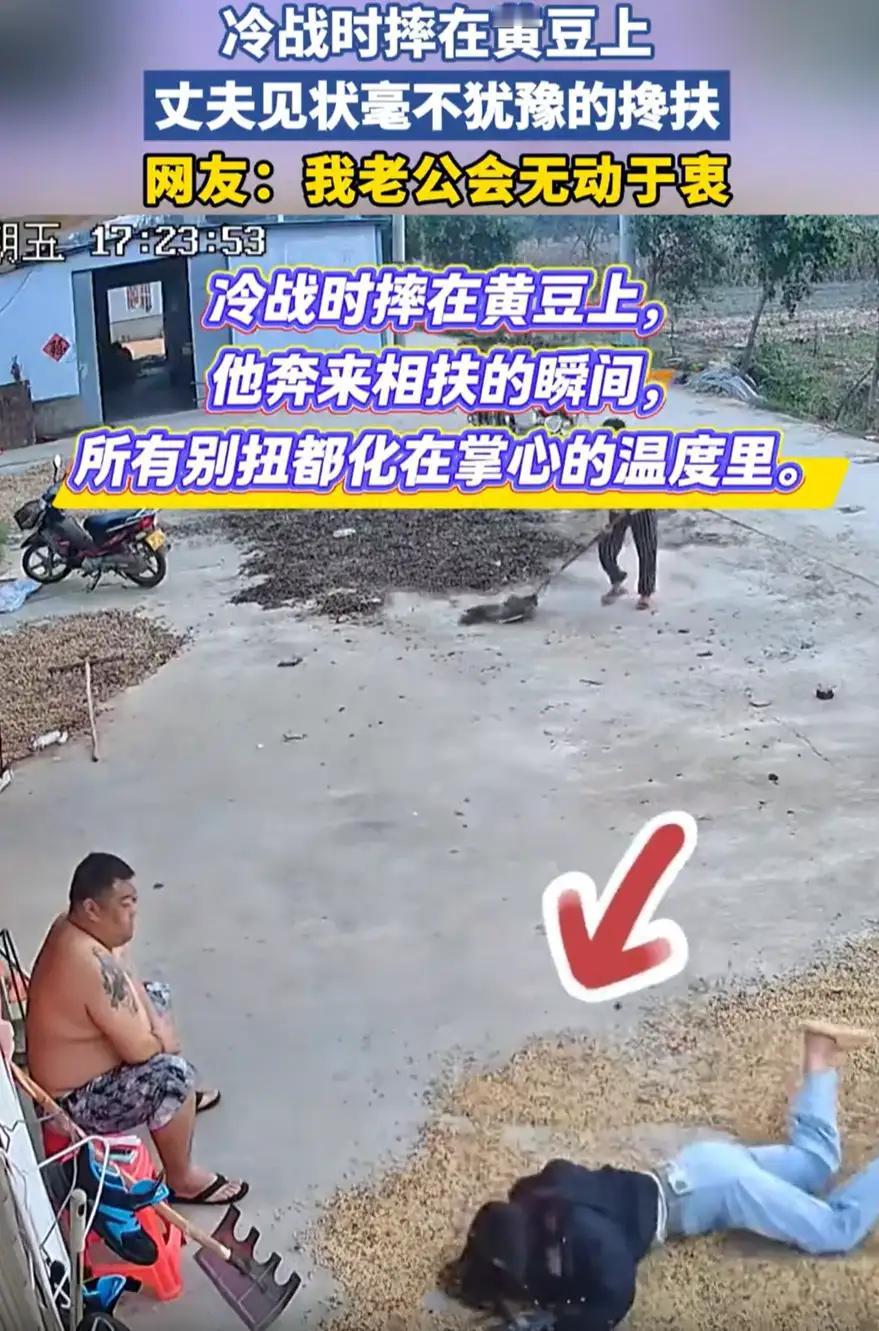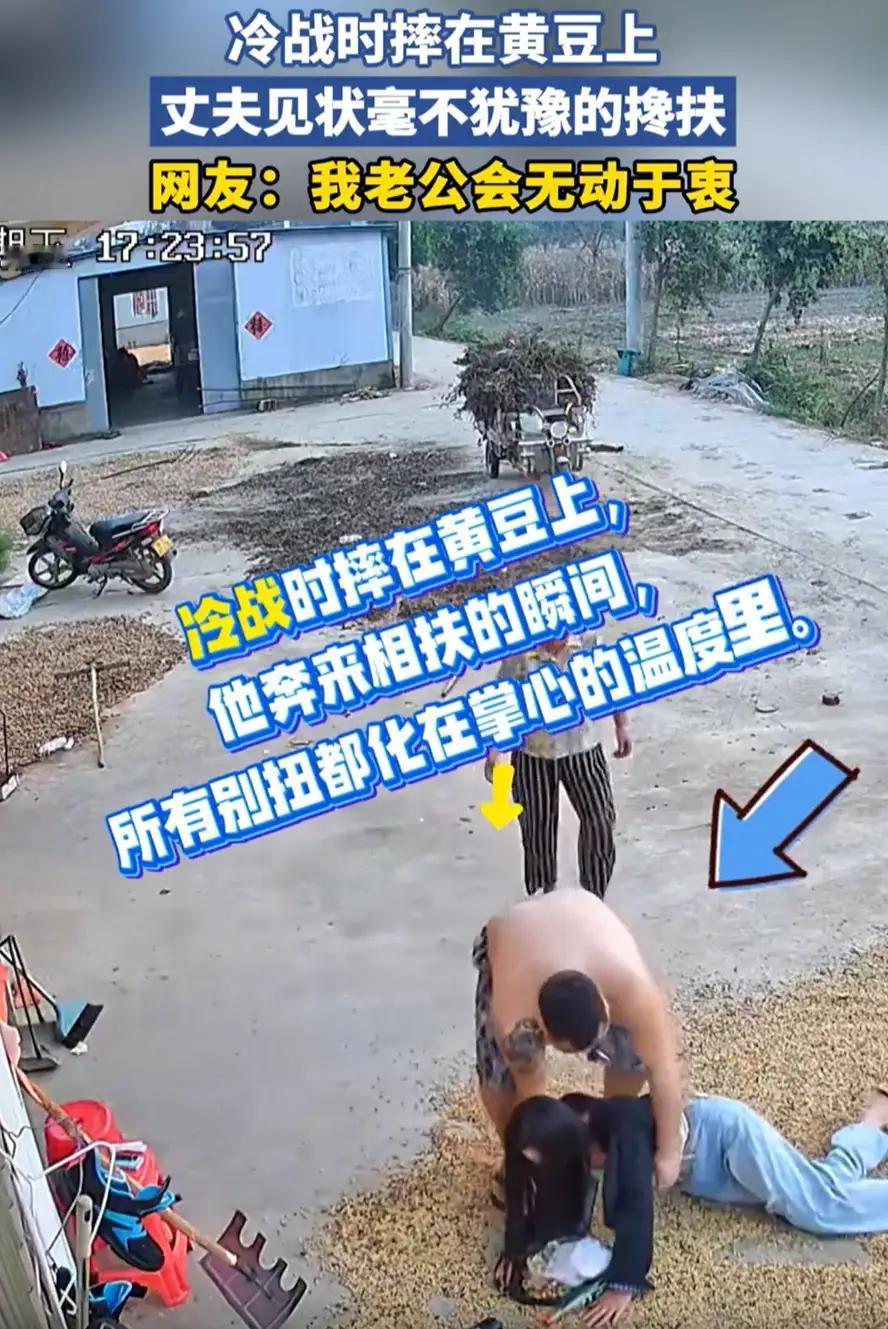 浙江,一对夫妻吵架打冷战,妻子拎着包正准备离开家,结果却不小心菜种地上晾晒的黄豆滑倒,好巧不巧就摔在老公的面前,老公犹豫一秒后连忙上前把妻子扶起来,那一刻所有的矛盾都化在了掌心的温度里。网友:换我老公会无动于衷这个故事真温暖,也让人感受到家庭中那份细腻的情感转变。夫妻之间的矛盾常常因为一点点意外而变得更加深刻,但正是这些瞬间的温情,让感情变得更加坚固。老公在妻子摔倒时的犹豫和及时扶起,展现出他对妻子的关心和在意,也让人感受到家庭的温暖。 网友的评论“换我老公会无动于衷”可能是在表达对自己伴侣反应的失望,也可能是在强调不同人的情感表达方式不同。有些人可能在关键时刻会表现出关心和行动,有些人则可能反应平淡甚至漠然。这也提醒我们,家庭关系中,理解和包容彼此的不同,是维系感情的重要因素。 总的来说,这个故事让人感受到爱与关怀的力量,也提醒我们在生活的点滴中,用心去关照身边的人。夫妻吵架感悟