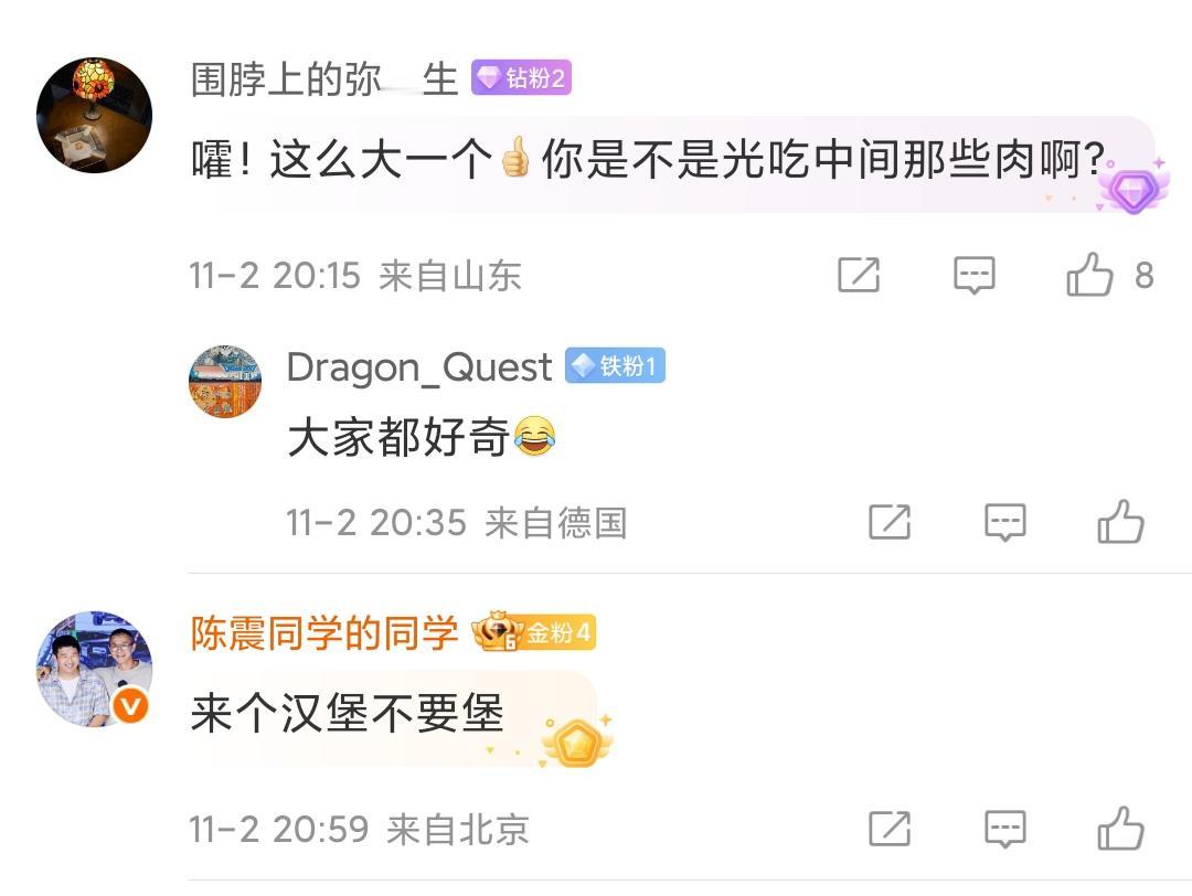 陈震:这你受得了吗? 这么大一份汉堡薯条,真的是超越了一般食物的非常多倍。 很好奇陈晨在面对这种食物的时候竟然能忍下来,不吃薯条不吃汉堡,只吃中间的牛排也是挺厉害的。 看来生酮饮食并不适合所有人,比如大部分人看到这种美食都会所有东西都尝一遍。