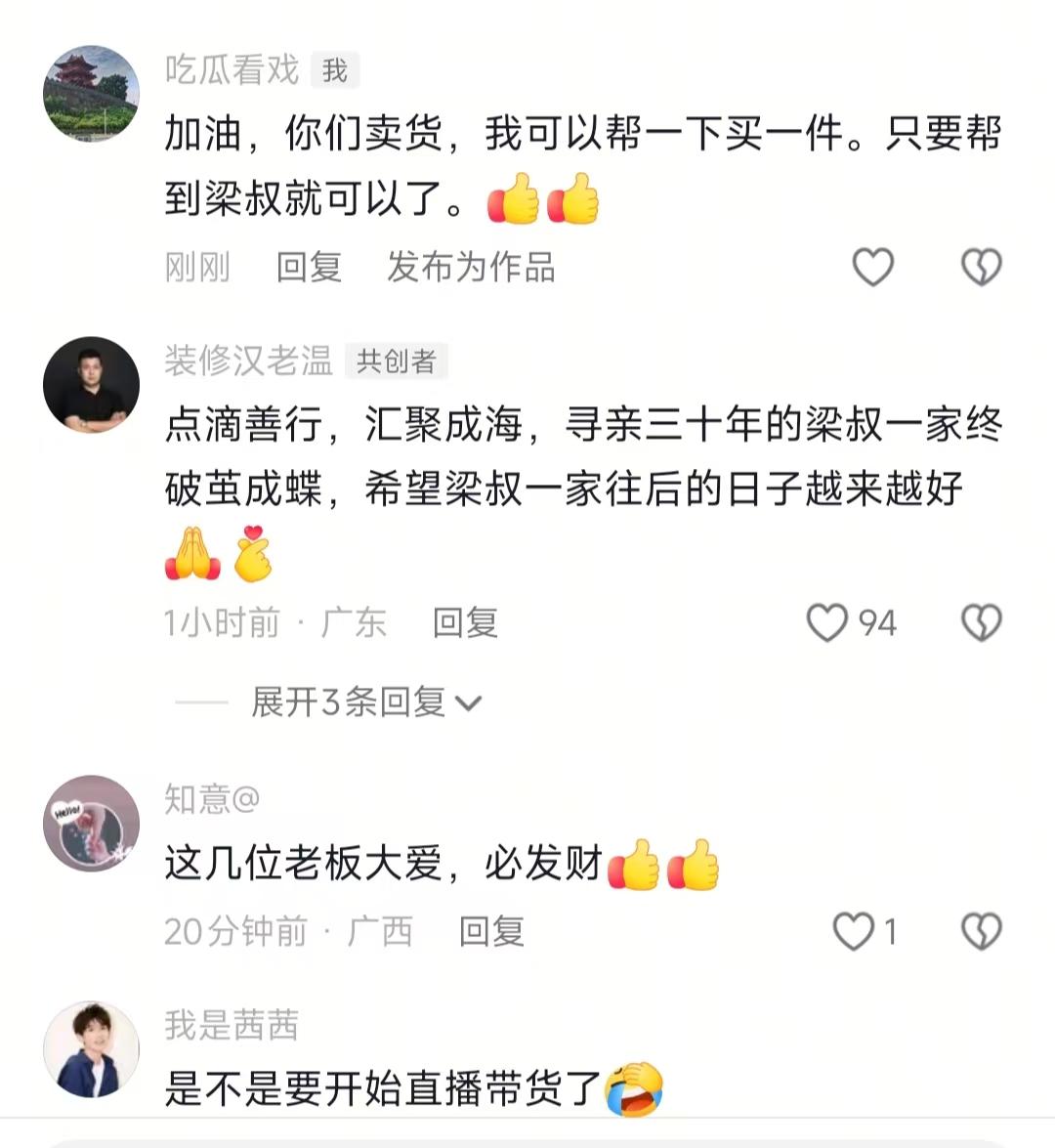 我预料到了寻子30年的梁叔夫妇,因为穷可能不会办认亲宴了 也预料到了有人可能会帮他们 万万没想到有个广东傻老板会突然跳出来说“家具+宴席全包”,给力到爆! 谁能想到寻子30年的梁叔夫妇,好不容易找到儿子梁志辉,结果连场认亲宴都掏不出钱,郁闷到崩溃!本来以为这就是个让人揪心的亲情故事,结果广东老板突然跳出来说“家具+宴席全包”,给力到爆!但说实话,我一开始还以为是炒作,毕竟现在流量时代,啥都能跟生意挂钩,不是吧? 说真的,梁叔夫妇这三十年真的太不容易了,足迹跑遍大半个中国,张贴的寻人启事堆起来比我人还高,积蓄稀了咣当花了个精光。 本来想办场像样的认亲宴,结果一算场地费、餐饮费,直接崩溃——根本承担不起啊!然后一家人只能麻溜地收拾房子,擦门窗、清杂物,忙得波棱盖儿都酸了,就想给儿子整个干净的家。我晕,换谁三十年盼着这一天,结果连场宴席都办不起,搁谁不郁闷? 就在梁家愁眉苦脸的时候,广东老板奈斯王带着同行找上门,直接说“家具全包,宴席搞掂,唔该晒”,我的天,这操作也太给力了吧!本来想直接夸他们是活菩萨,结果翻评论区直接看懵了——有人说“太棒了!这才是正能量”,有人却怼“胡扯!明明是收割眼泪流量”。我和小伙伴都惊呆了后来才知道,之前有老板赞助寻亲家庭后,借着热度带货翻车,所以大家才这么敏感,咋整? 奈斯王后来在评论区说,还要帮梁叔直播带货,“流量带起来,梁爸经济就好啦”。有人说这叫“帮人就是帮自己”,跟老辈人说的“积德”一个意思,但说实话,这事儿总感觉有点膈应——纯公益为啥非要提流量?我之前还刷到有网友吐槽“本来挺感动的,一提带货瞬间没意思了”,不是吧?难道做好事就不能有商业考量?或许是我太瓜兮兮了? 结果没过几天,就看到梁叔发视频,新家具摆得巴巴适适,认亲宴场地也布置好了,还说“谢谢老板们,儿子回来能住得舒服了”。然后直播带货首秀,网友们嘎嘎下单,梁叔夫妇笑得合不拢嘴,弹幕全是“支持梁叔,雄起!”“买就对了,这才是双赢”。我晕,原来之前的质疑都是瞎操心,人家真的帮到了实处,这波反转太完美了!有人说“这就是‘善有善报’,不管老板初衷咋样,结果好就行”,好像确实是这个理儿~ 总之,这事儿看下来,我也算明白点门道了。遇到这种热点,咱别上来就站队骂“炒作”,也别盲目跟风当“韭菜”。想帮人就直接下单支持,不想买就默默祝福,随便别人咋折腾呗~ 毕竟梁叔夫妇苦了三十年,现在能改善生活,万岁!最后我还想说,吃瓜归吃瓜,善良别掺假,遇到真需要帮的人,麻溜地搭把手,得闲饮茶聊真相,咋样?