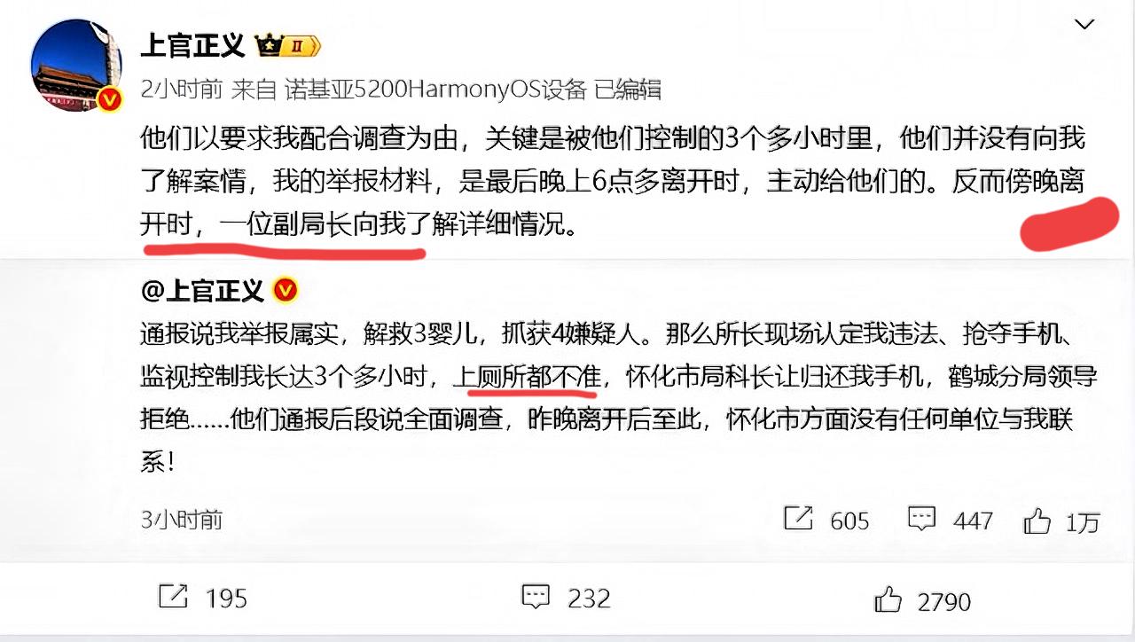 长期与警方合作的资深打拐志愿者上官正义成功帮助怀化警方破获一起贩婴案,却被当地警方如同“嫌犯”般无辜被控制3个多小时…… 上官正义这两日多次发文质疑当地派出所对其无辜“控制”,却与警方通报的“配合调查”有出入。可能是双方沟通有误,也可能是警方执法存在瑕疵。不过好在警方在通报里肯定了其贡献,也表示会对其在警局配合调查等情况予以核实。 其实不管上官正义出于红也好,其它也罢,确实多次帮助警方破获拐卖案件。其实我倒希望社会上多些这样的高调网红,这样才能让罪犯们无所遁形。 保护举报人的合法权益,就是保护社会正义的源头活水。若上官正义所言属实,当地派出所所为确实可能会挫伤公众参与公共事务的意愿。 我们期待警方能尽快完成调查,给当事人和公众一个明确的交代。唯有确保正义的程序也能充满温度,才能激励更多的“上官正义”站出来,共同守护社会的良知与底线。