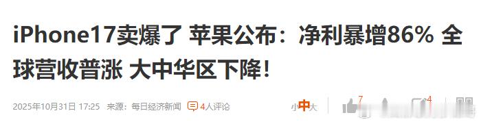 iphone17卖爆了 大中华地区销售下滑,苹果利润竟出现暴涨