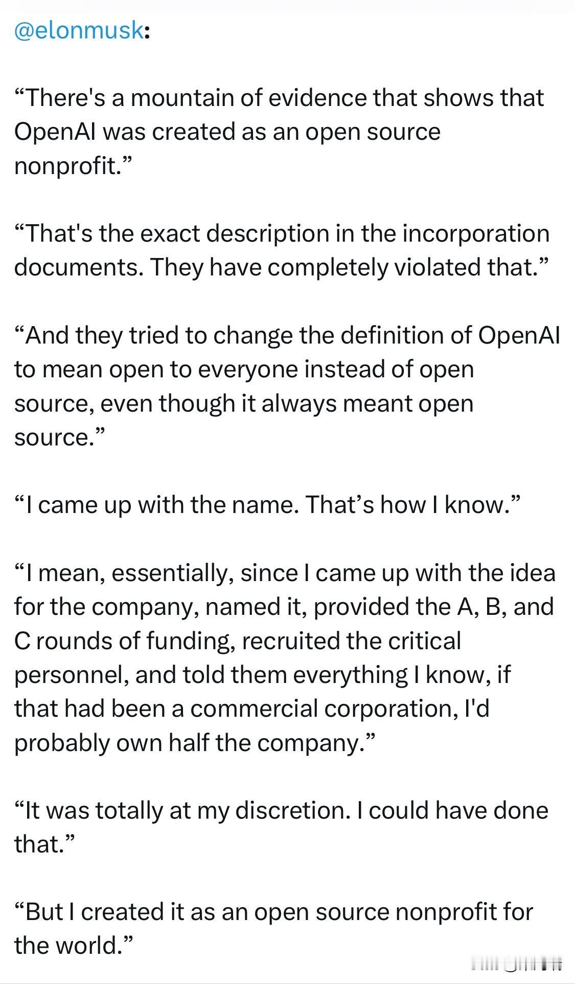 马斯克说:我本可以拥有OpenAI一半的股权! OpenAI是我创立的,名字我取的,A、B、C轮融资我都参与,还招募了核心团队,把我知道的一切都教给他们。但我选择让它成为开源、非营利、为世界服务的组织。 可当他们发现能赚钱后,一切都变了——明明章程写着,任何高管都不得从OpenAI获利!