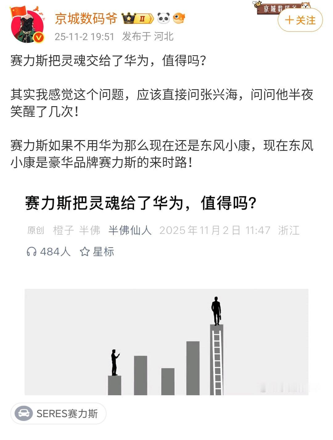 赛力斯把灵魂交给华为,值得吗? 谈论这个话题,不知道大家记不记得赛力斯的第一款车SF5,这款车可以说没有什么关注度,但是确实是这该品牌发展的一个起点。 如果赛力斯没有和华为合作,那么现在大家都不会提这个品牌,比如找一个和赛灵斯实力当年差不多的企业凯翼汽车,大家对这个品牌有什么印象吗? 还是因为赛力斯成功了,所以大家才会探讨赛力斯的成功,有很多企业并没有成功,在互联网上压根就没有任何声音。 各位是怎么看的?欢迎评论区留言。